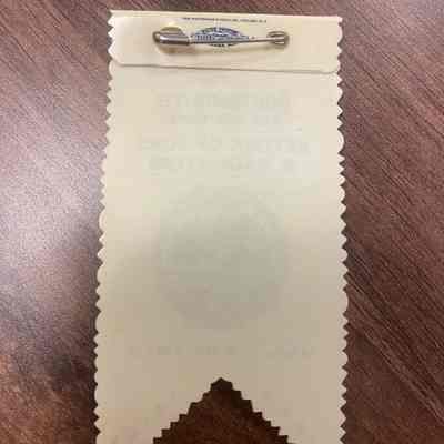 Two of two. Small badge, with image and text in blue, and with irregular scalloping on sides and bottom; bottom notched to form a triangle; maker’s mark on the back and a safety-pin clasp inserted through folded-over section.
