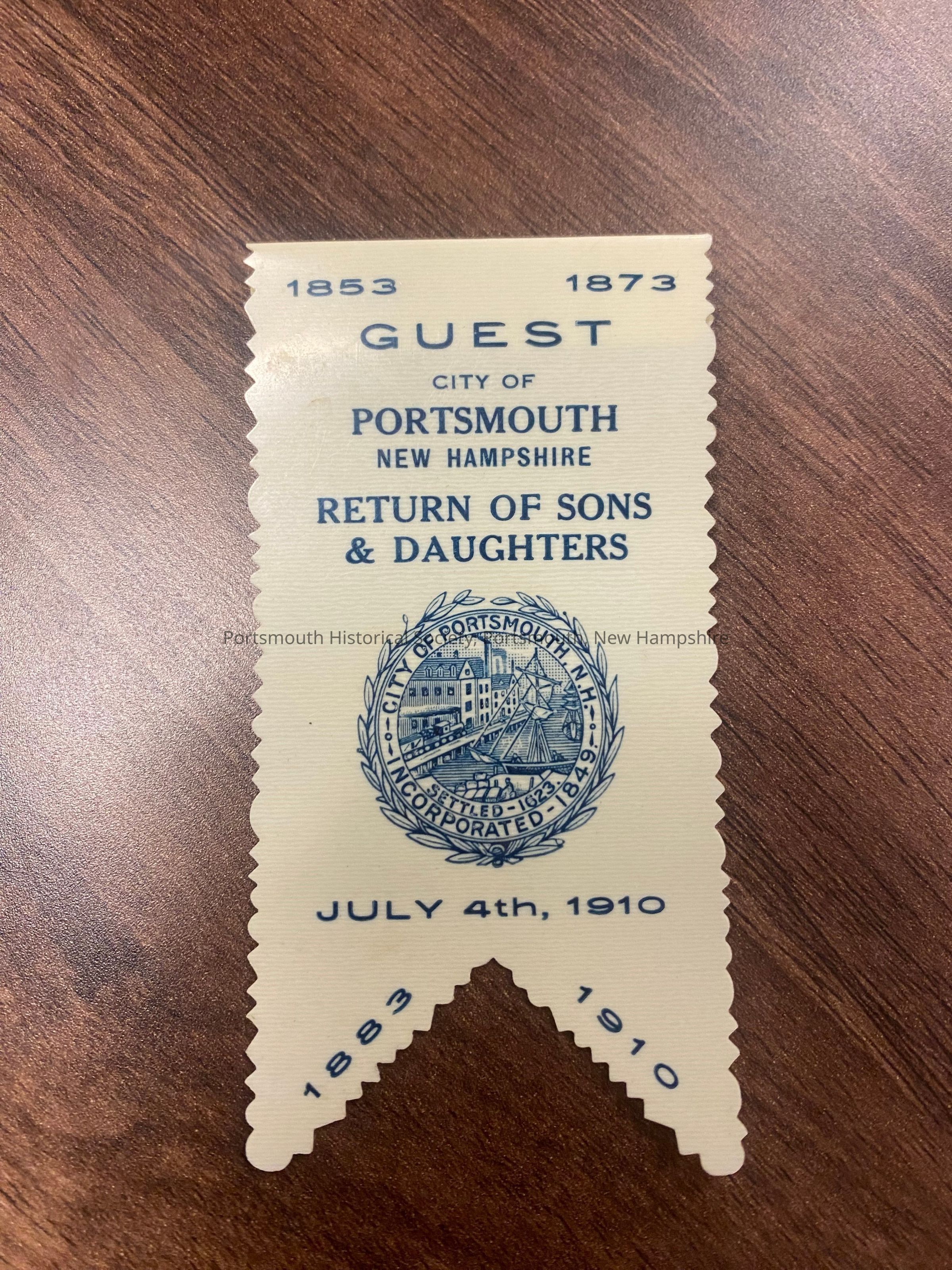 On the front, “1853 / 1873 / GUEST / CITY OF / PORTSMOUTH / NEW HAMPSHIRE / RETURN OF SONS 7 DAUGHTERS / [seal of the city of Portsmouth] / JULY 4TH, 1910 / 1883 / 1910”Acquisition
