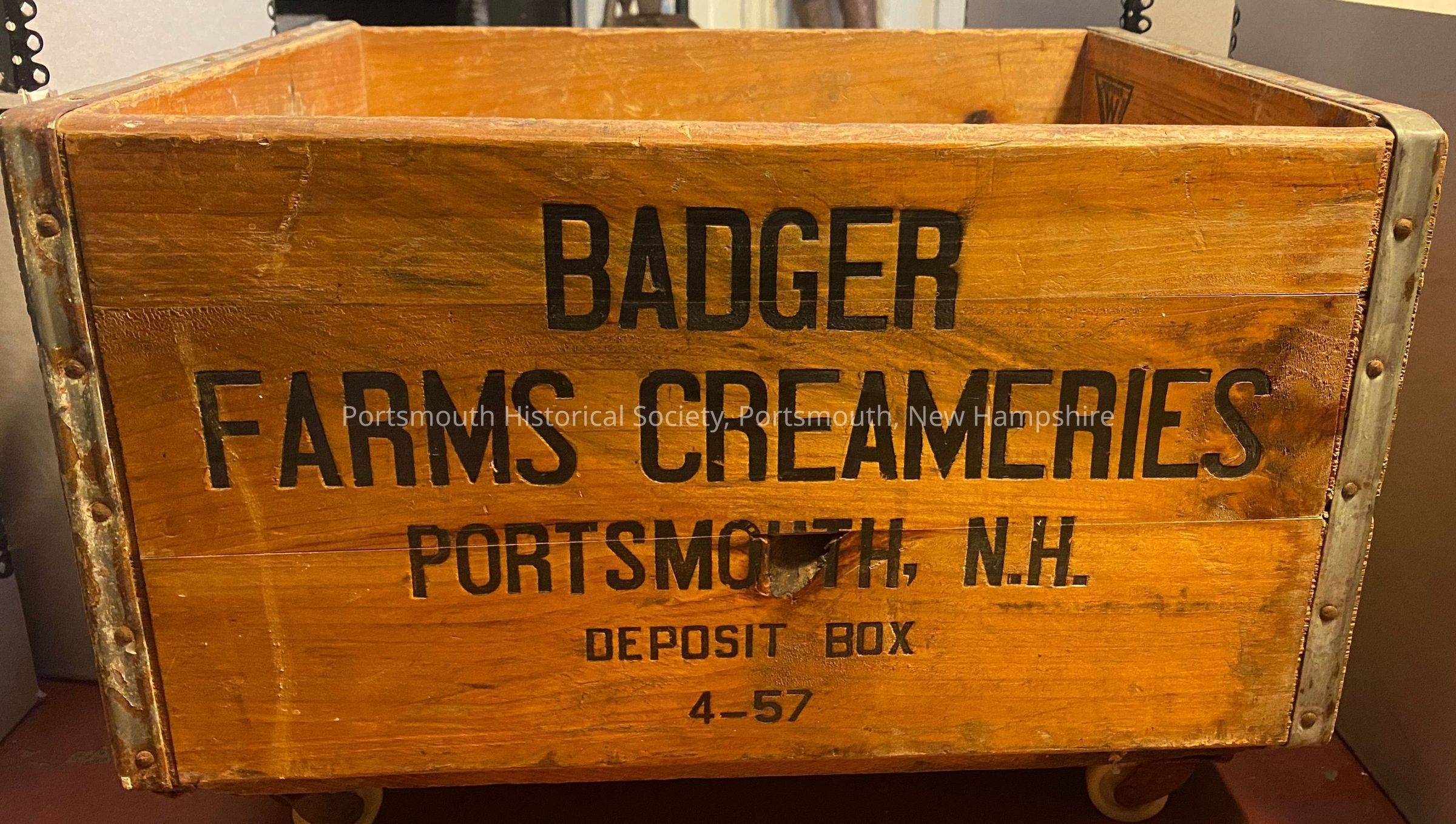 Stenciled in black on exterior of two long sides: 'BADGER / FARMS CREAMERIES / PORTSMOUTH, N.H. / DEPOSIT BOX / 4-57"