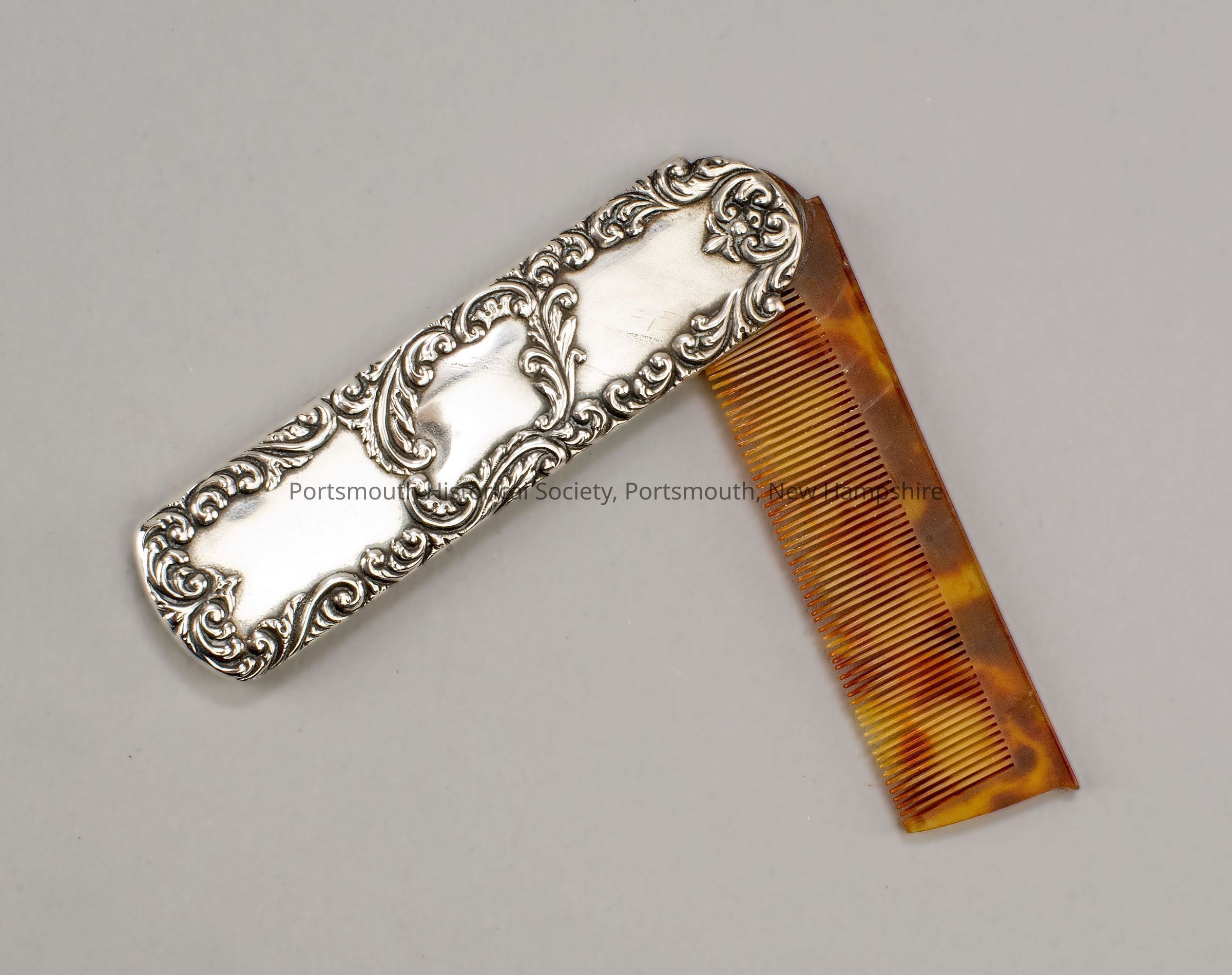 Ladies folding tortoise shell comb in a sterling silver case. Comb is straight and case has a stylized floral pattern. Found in collection. Late 19th C.Collection