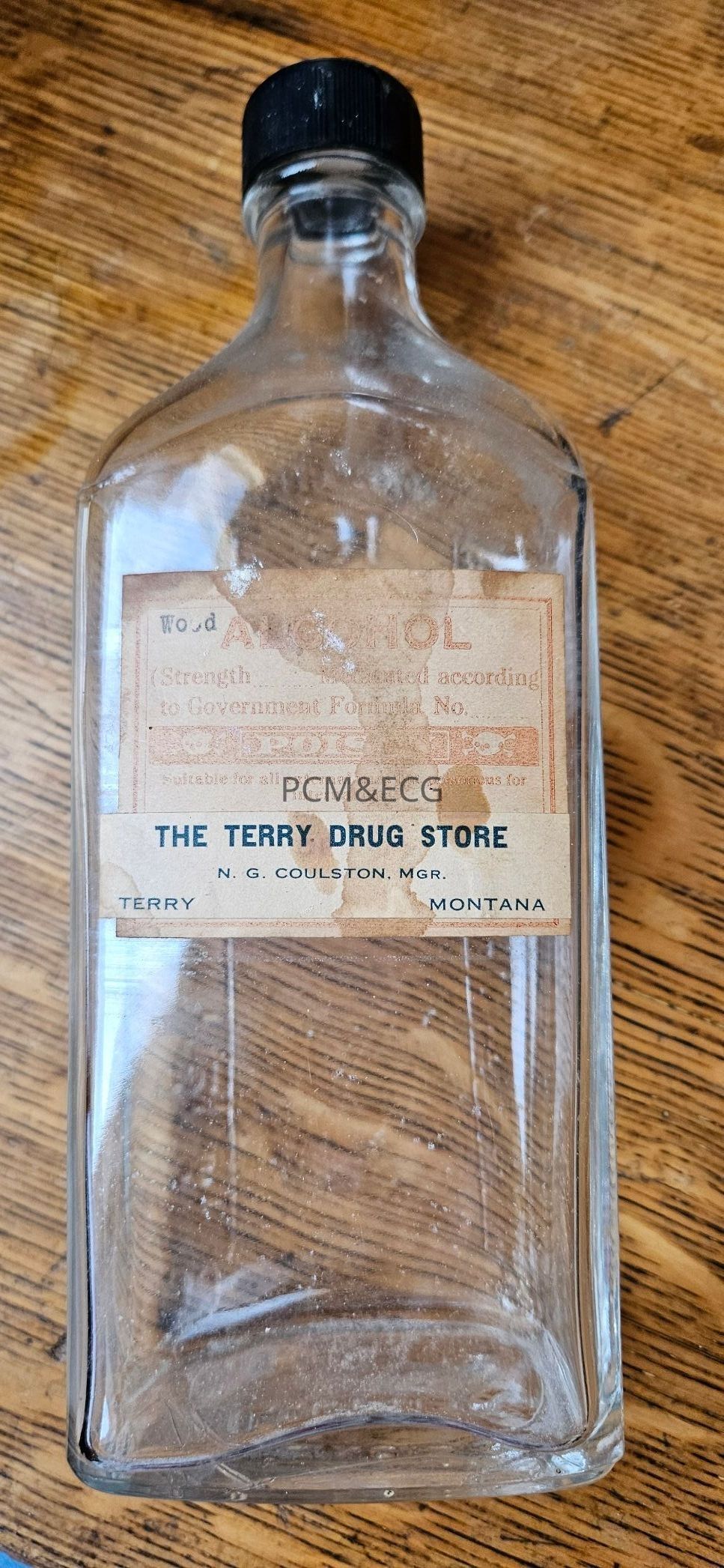 Large glass medicine bottle with paper label and black plastic screw top. Label marked: wood alcohol (Strength ........ Medicated according to Government Formula No. .... POISON Suitable for all external use [illegible] poisonous for internal use The Terry Drug Store N. G. Coulston, Mgr. Terry MontanaAcquisition