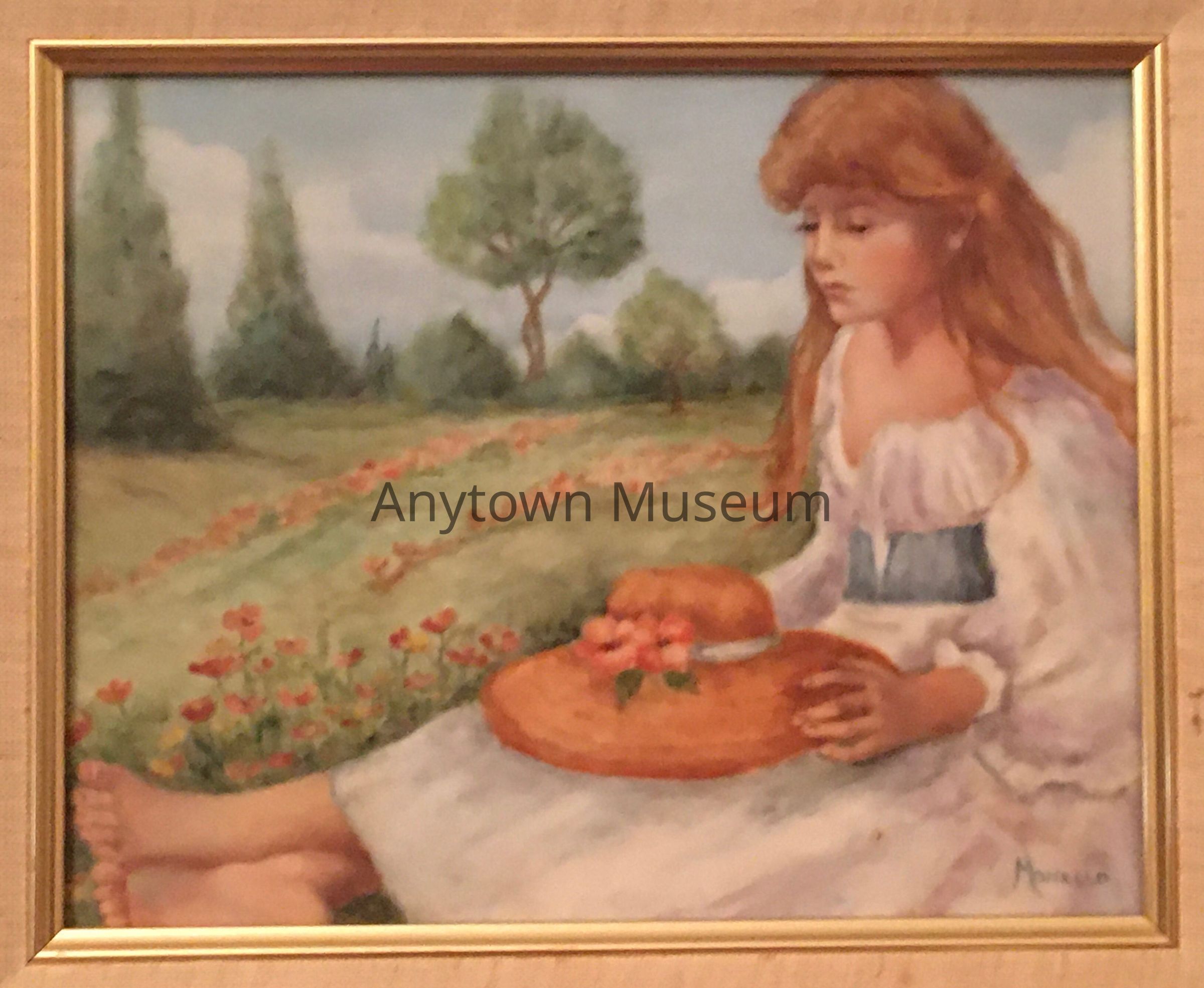 Oil on porcelain painting depicting a young girl (Bernice) sitting barefoot in the garden with her hat on her lap.Type of Painting