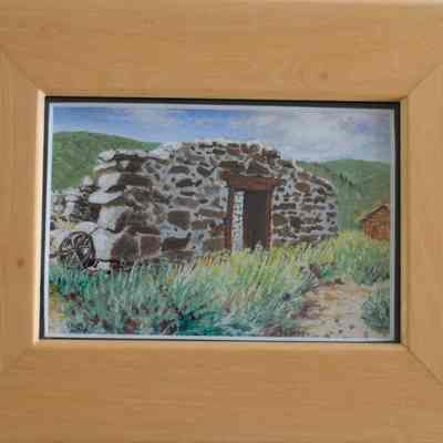 Watercolor painting of the ruins of the front of a stone building in Bodie, CA. A wagon wheel leans against the left wall, and in the right distance can be seen a portion of a wooden building.Type of Painting