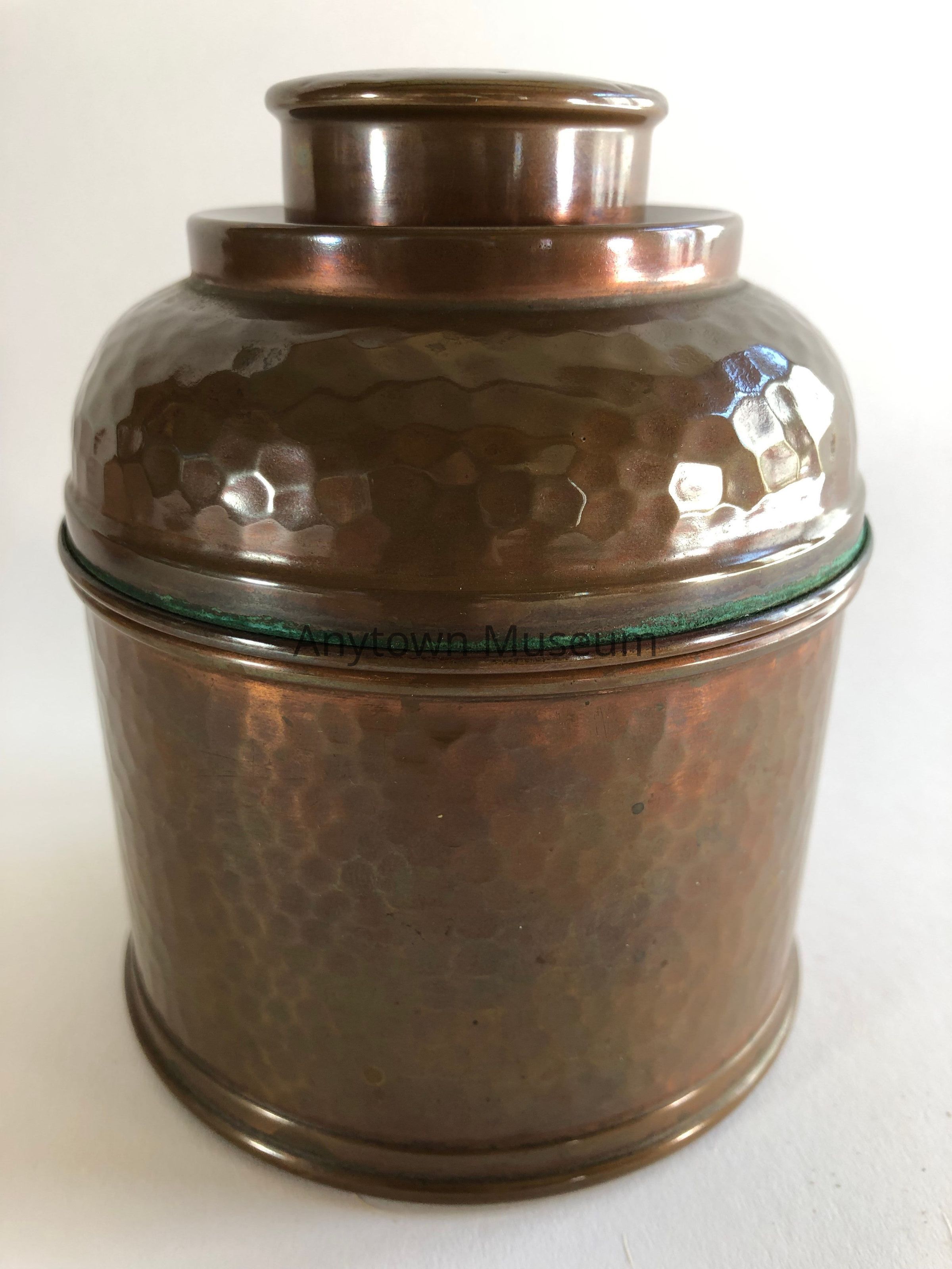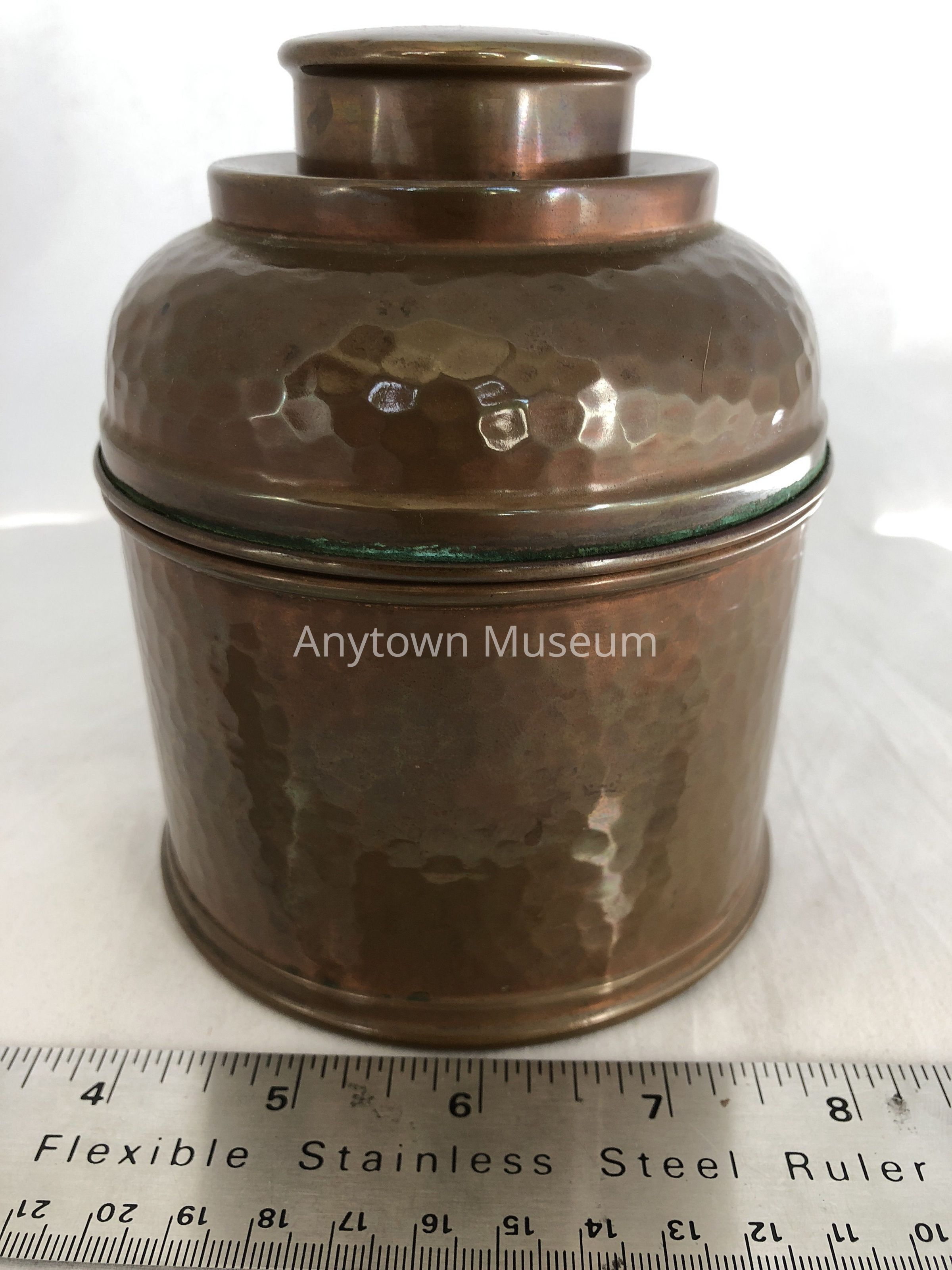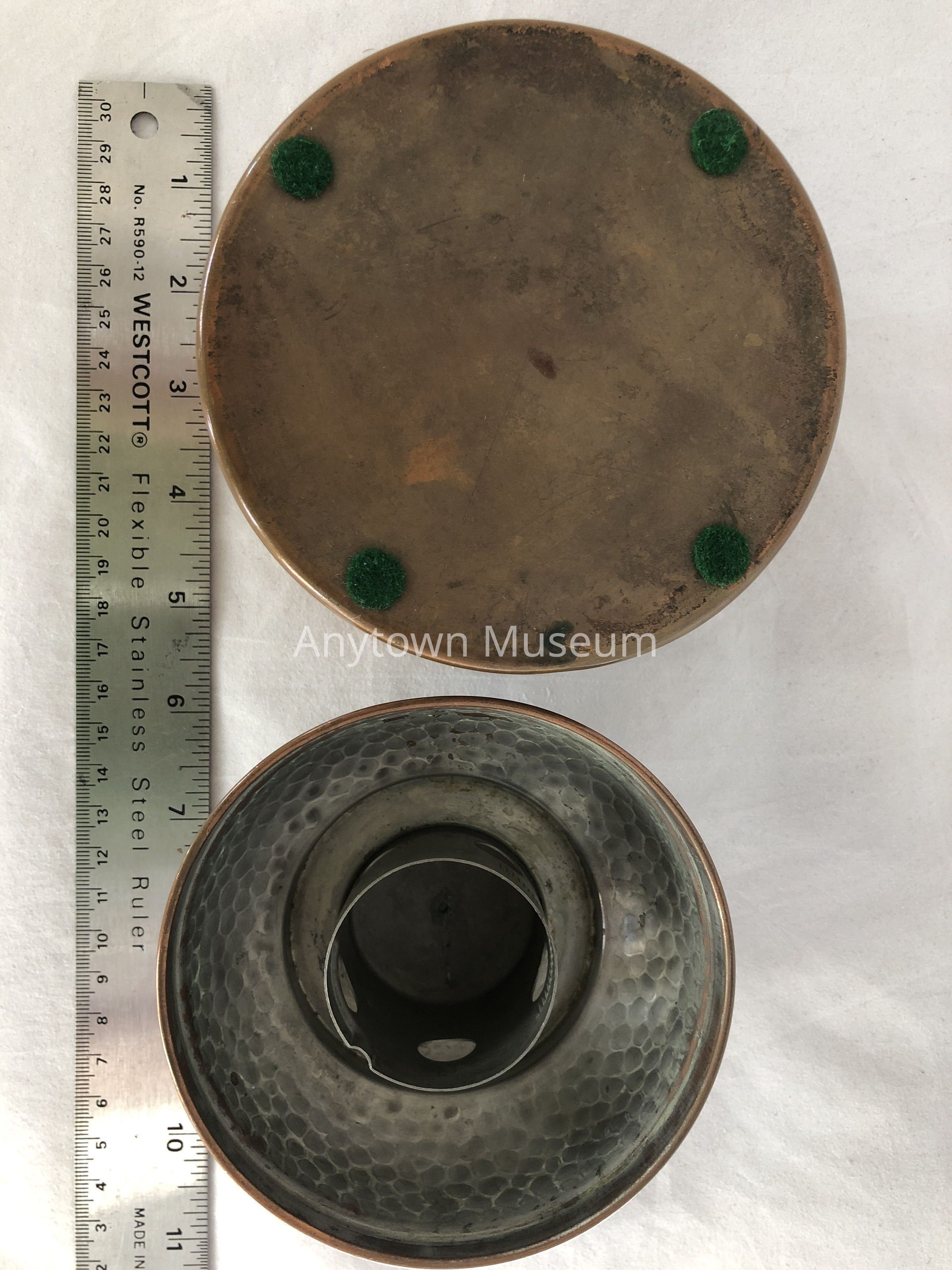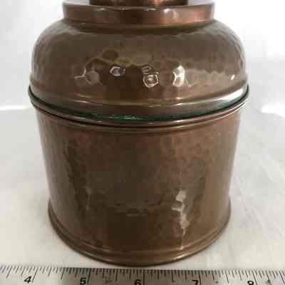 Small hammered copper humidor. The interior of the lid has a round fixture inside it that appears to have had another part that fit within it- perhaps something to maintain the humidity. There are four small felt circles affixed to the base.Context