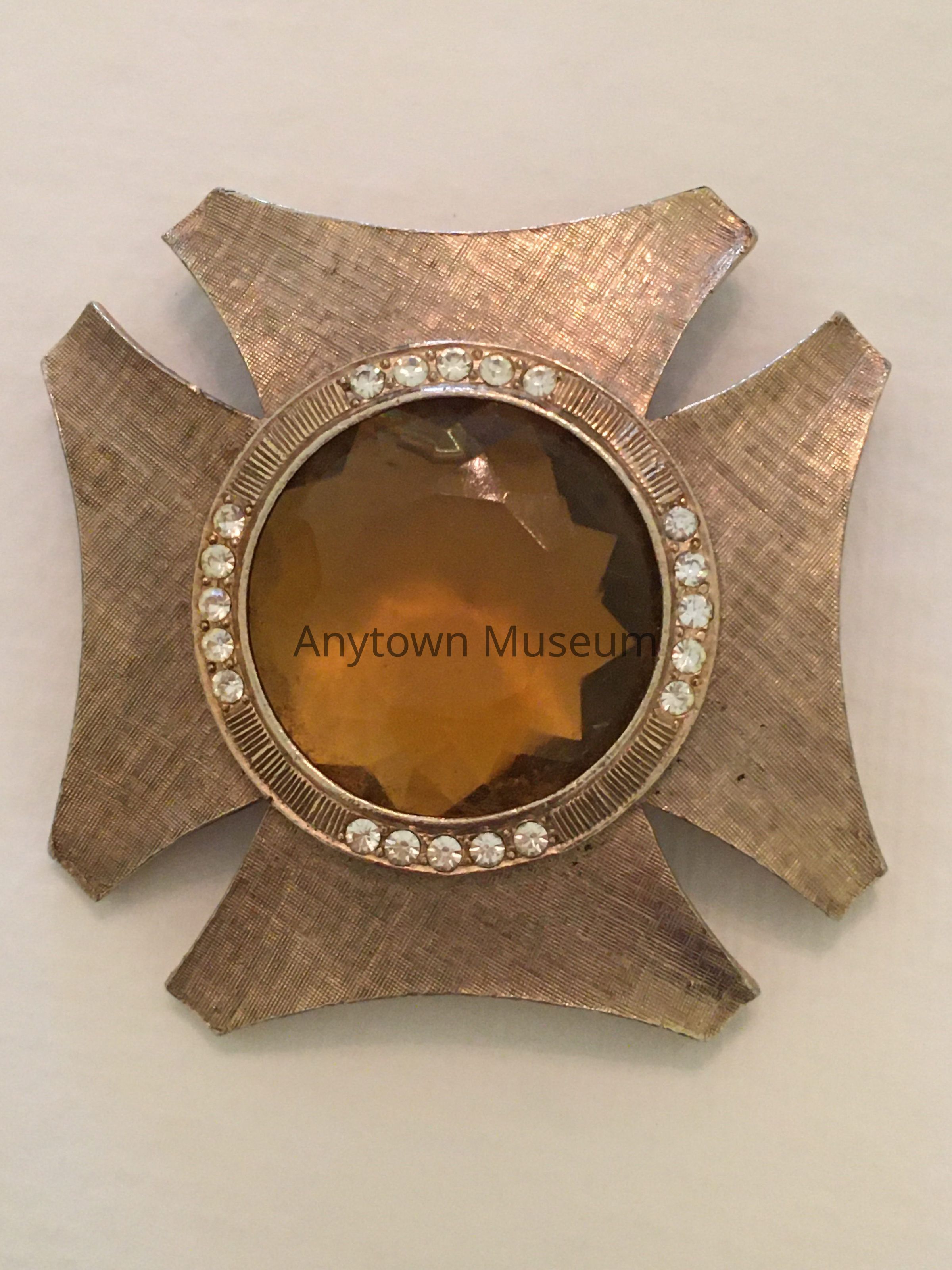 Cross shaped brooch with a translucent brown stone in the center with small diamonds around the edge.Acquisition