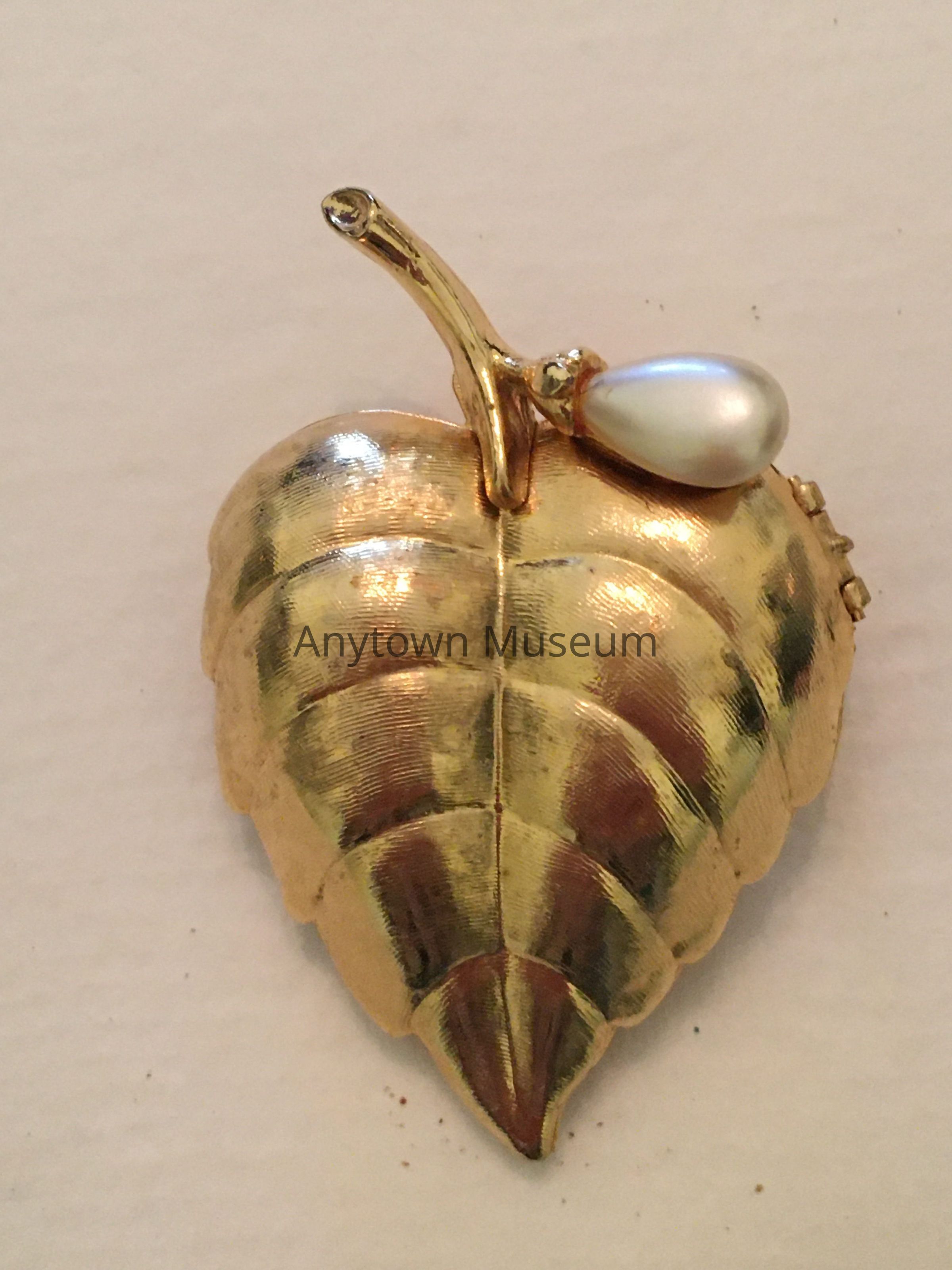 Leaf shaped brooch with one fresh water pearl. The brooch is hinged on one side and opens like a locket.Acquisition