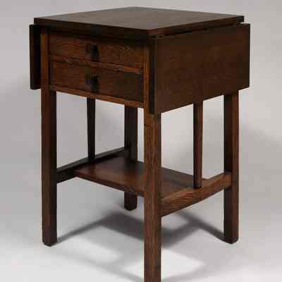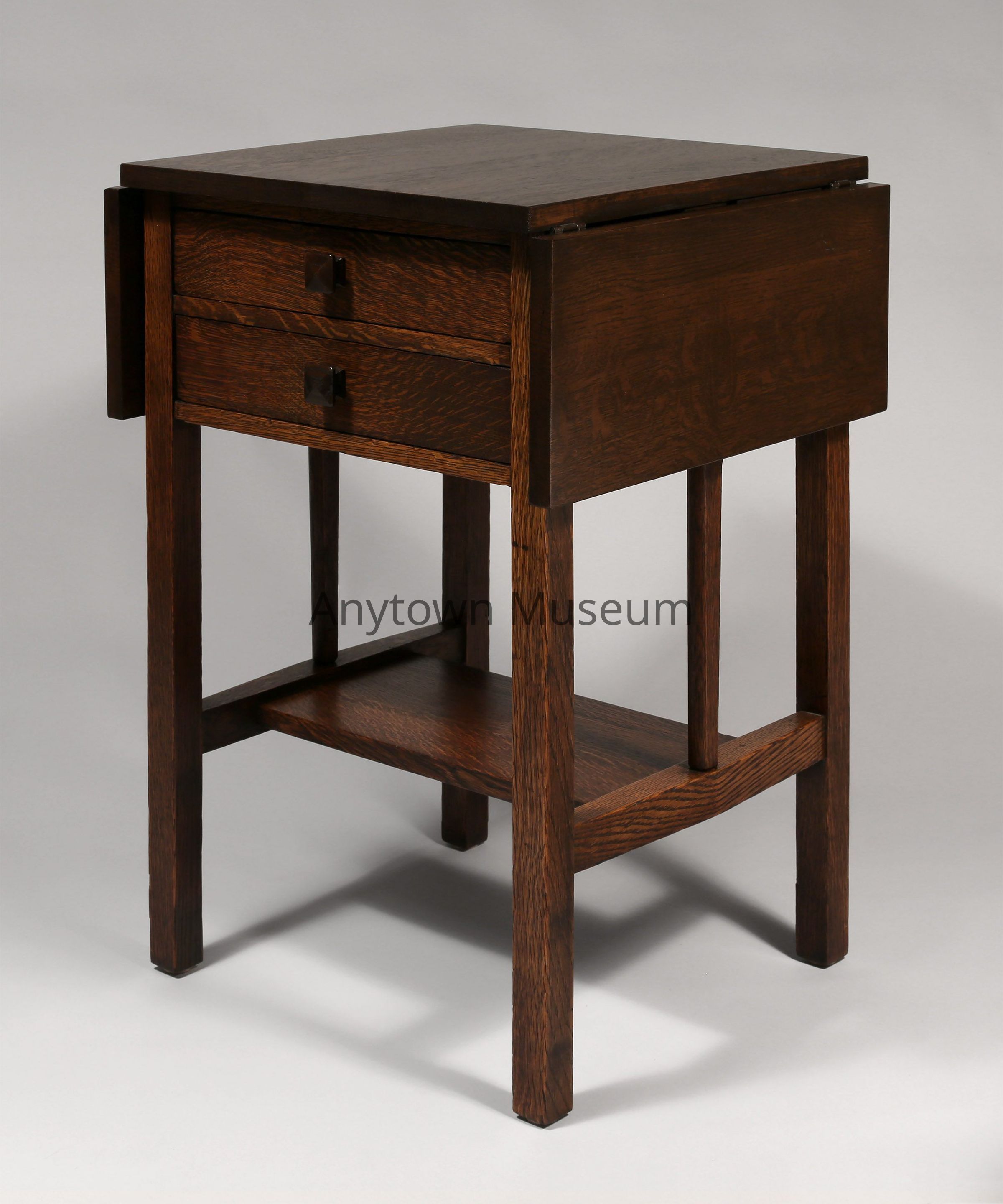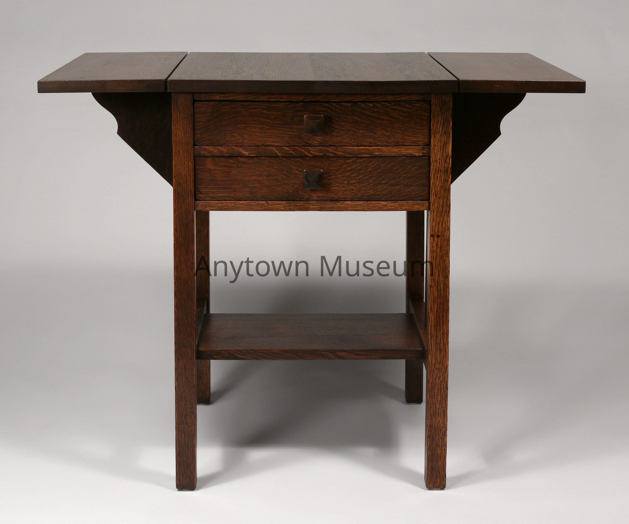 Mission or Arts and Crafts style drop-leaf telephone table in quartersawn oak with drop leaves on the sides, two shallow front drawers and a lower open display shelf.Acquisition