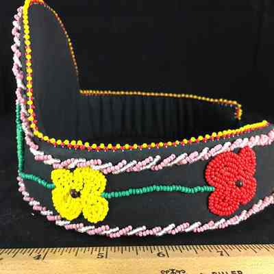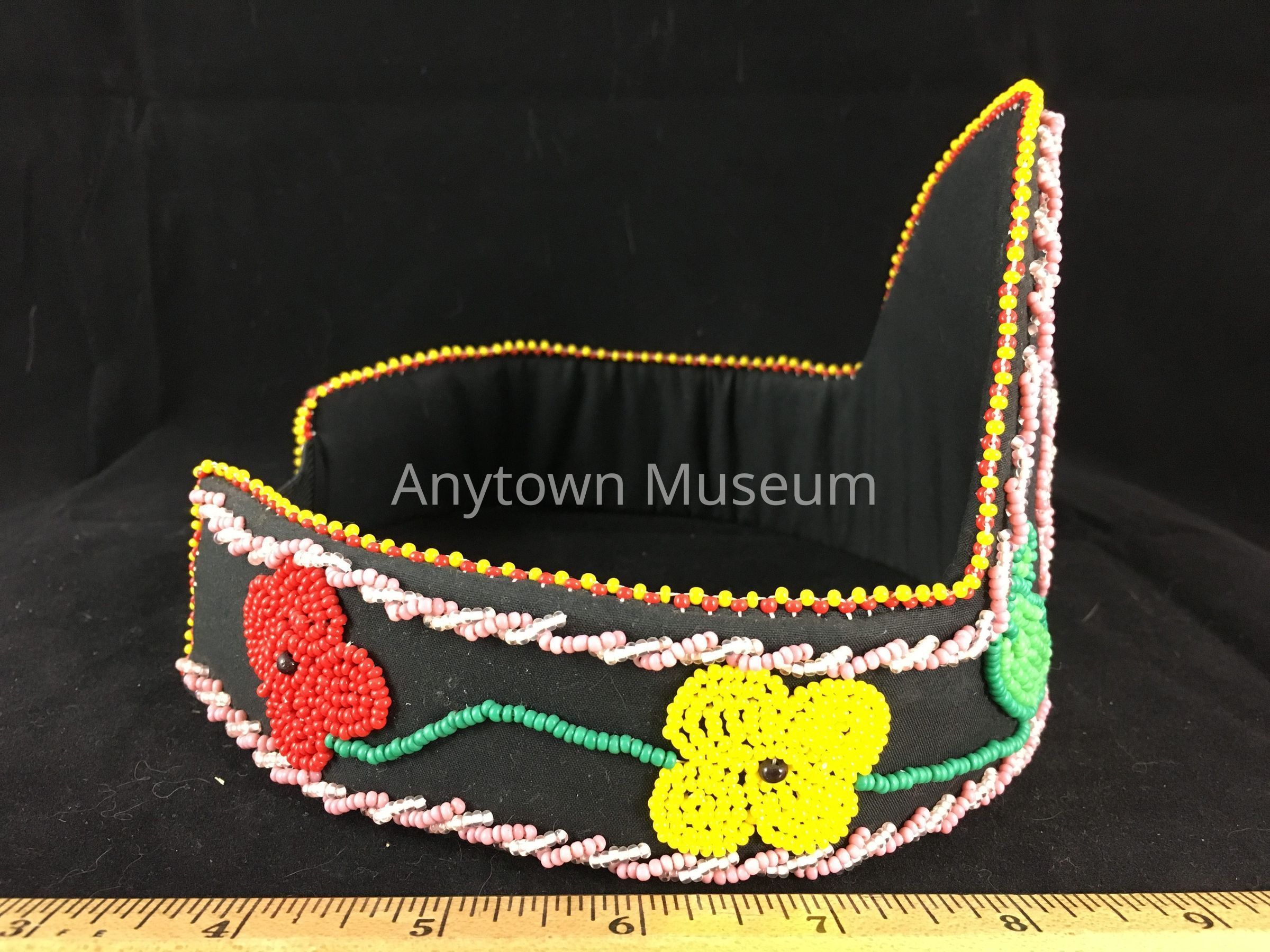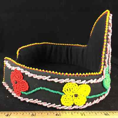 Young girl's beaded headdress or crown depicting a large white, pink and black flower on the front and yellow and red flowers on the sides.Acquisition