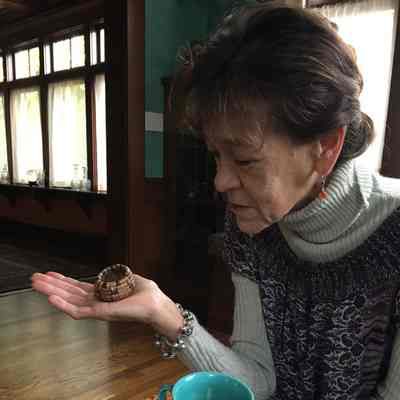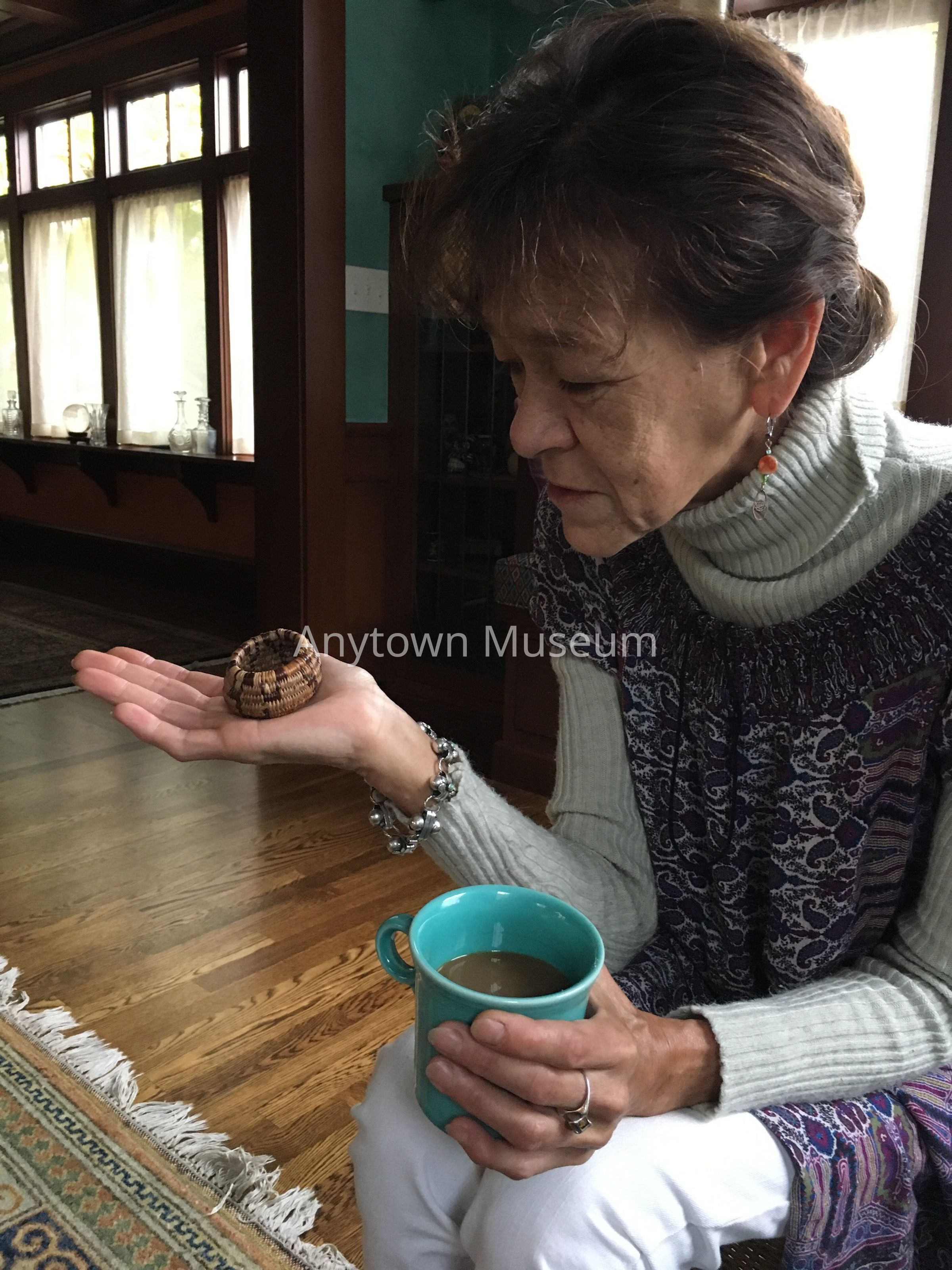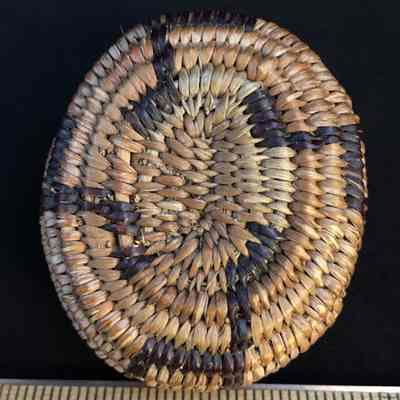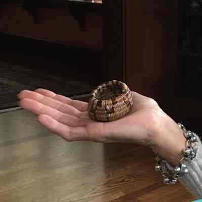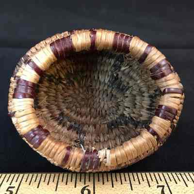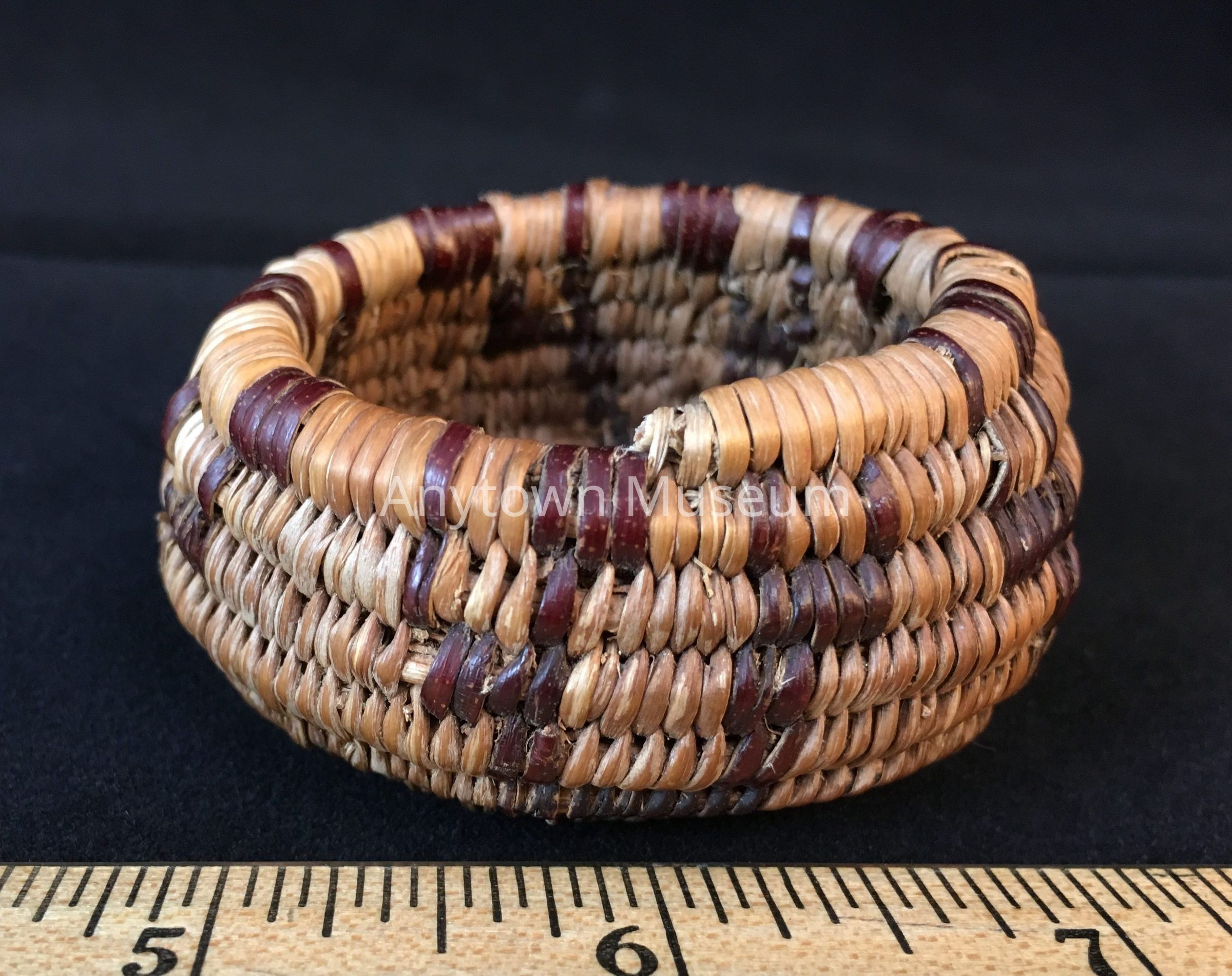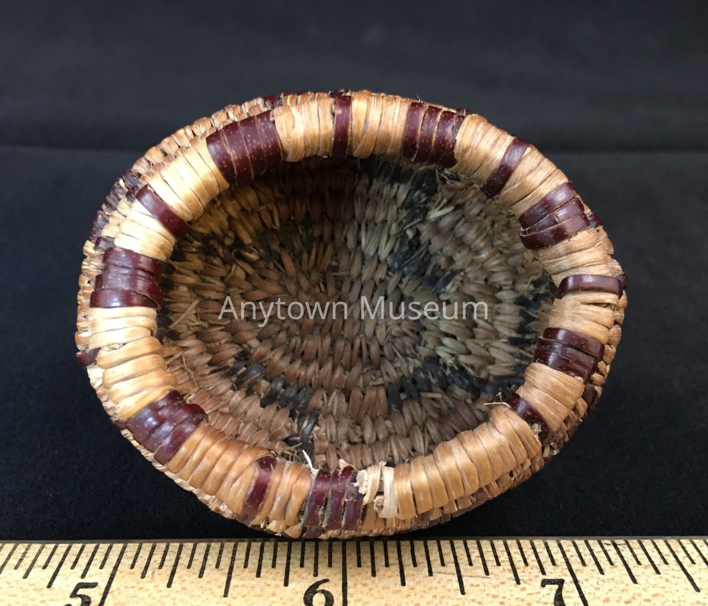 Small oval egg-sized basket with four design elements in redbud that begin with small horizontal lines which branch out upward and outward