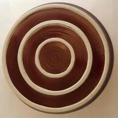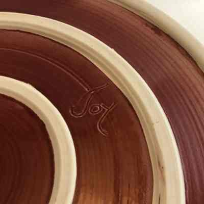 Shallow, red glazed serving dish decorated in white triangles with with a traditional Karuk basketry pattern in white triangles made by innovative Karuk potter Joyce NorellContext