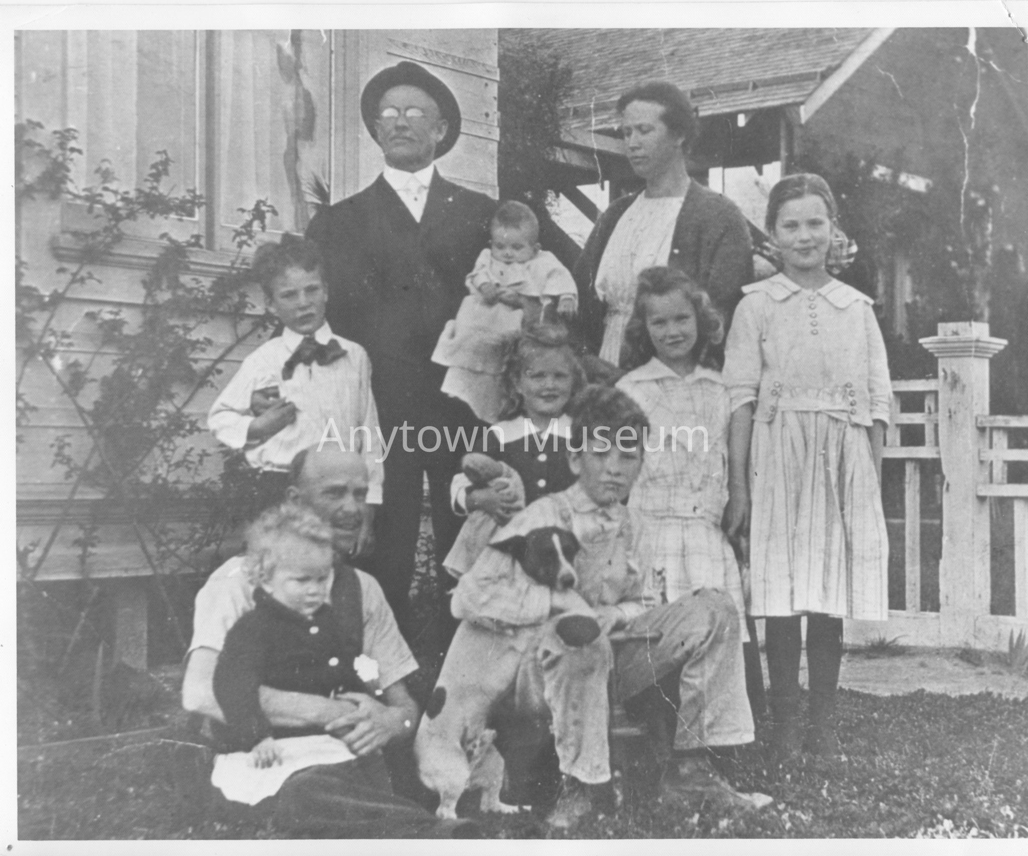 Photo depicting Wesley Adams (seated, on the lower left) with several of his children including Jane Adams - holding a doll in the center- Wesley Jr., on the left, and Joseph with a dog; his wife Jane (standing in the back), his father in law holding baby Pearl Adams, and several cousins.Photograph Details