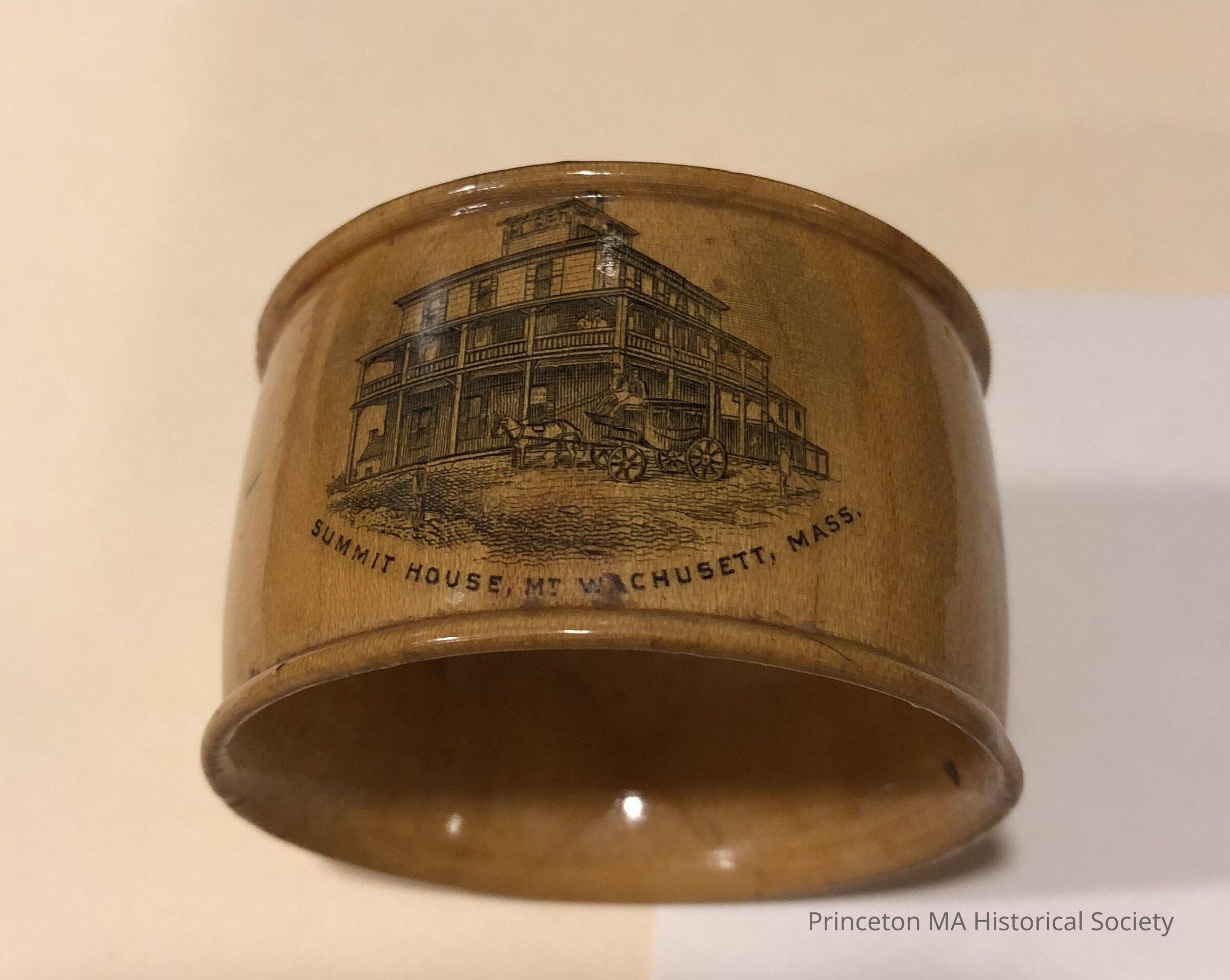 Wooden Souvenir showing Wachusett Summit House number two. Mauchline Ware. Wooden Napkin Ring with smooth edges.Location