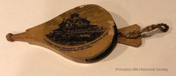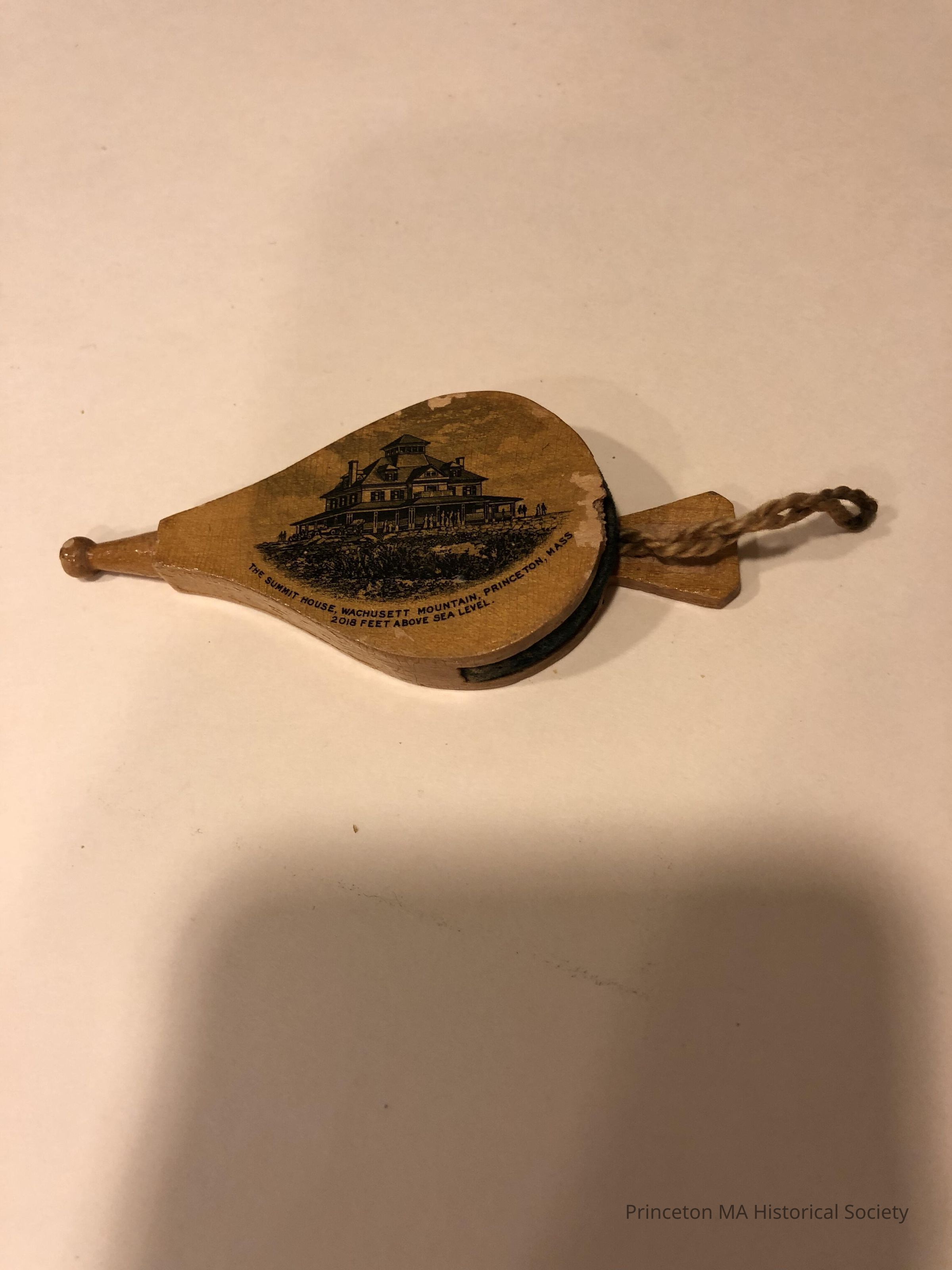 Mauchline Ware Souveniers depicting Wachusett Mountain House number three. Wooden thimble shaped like a bellow marked 'and' on the back. Assuming scotland. Blue velvet pin cushion with a yellow rope loop.Location