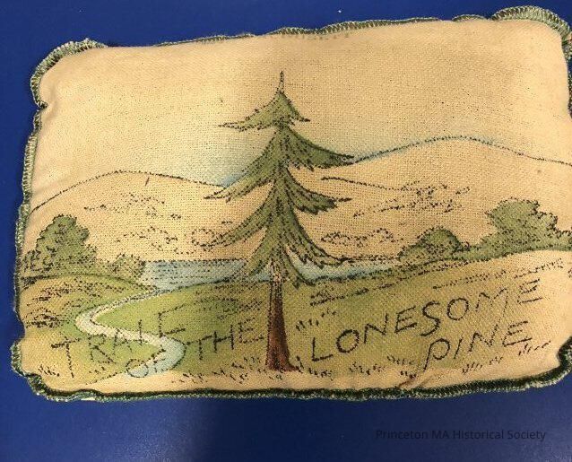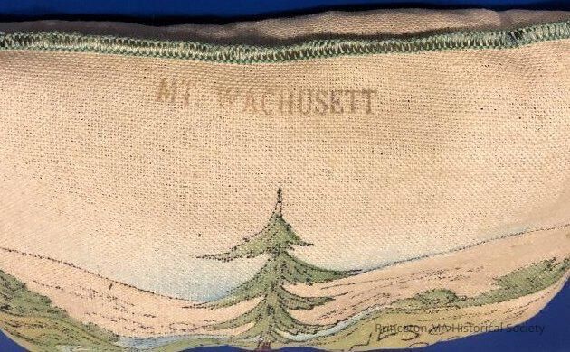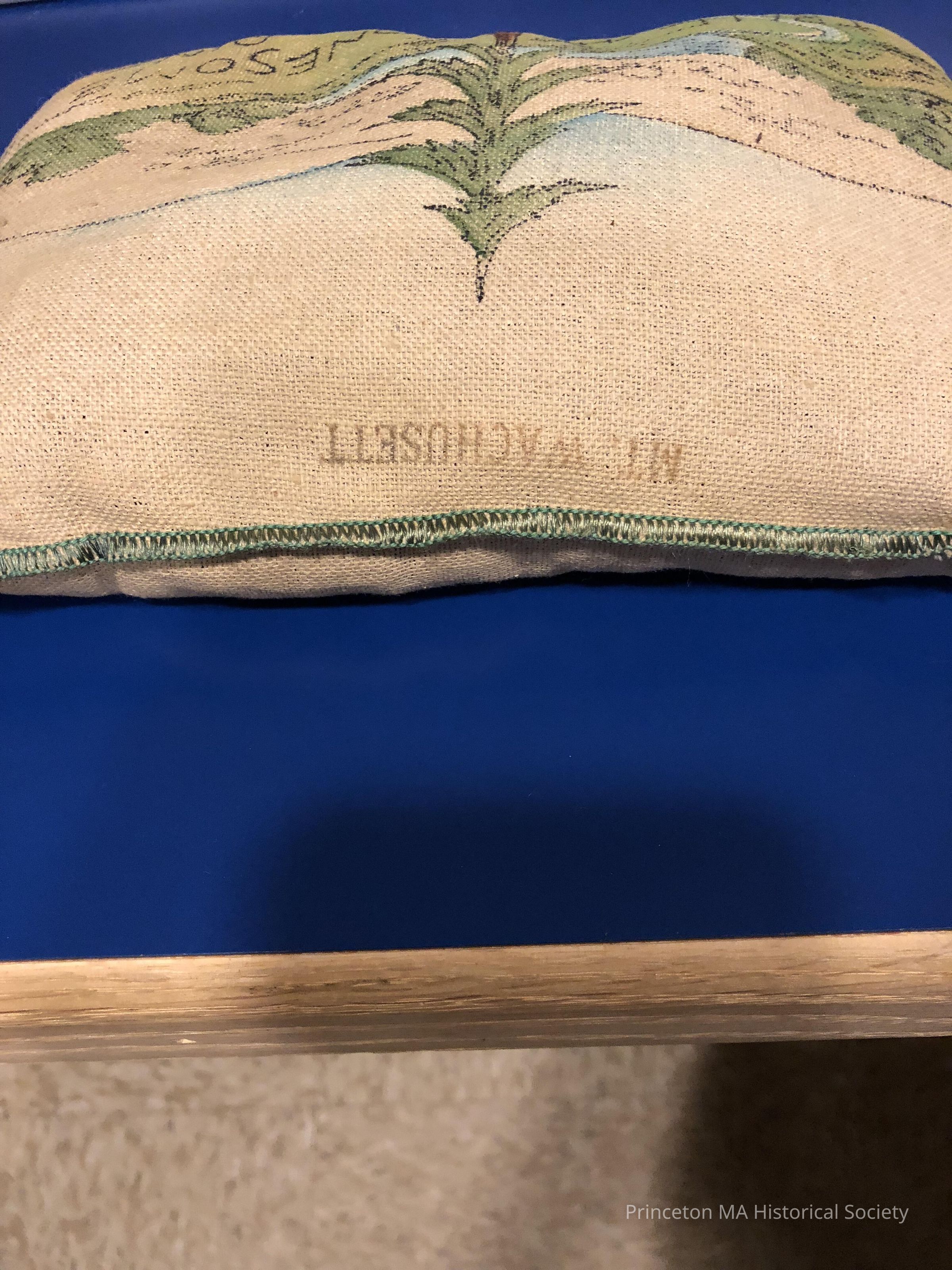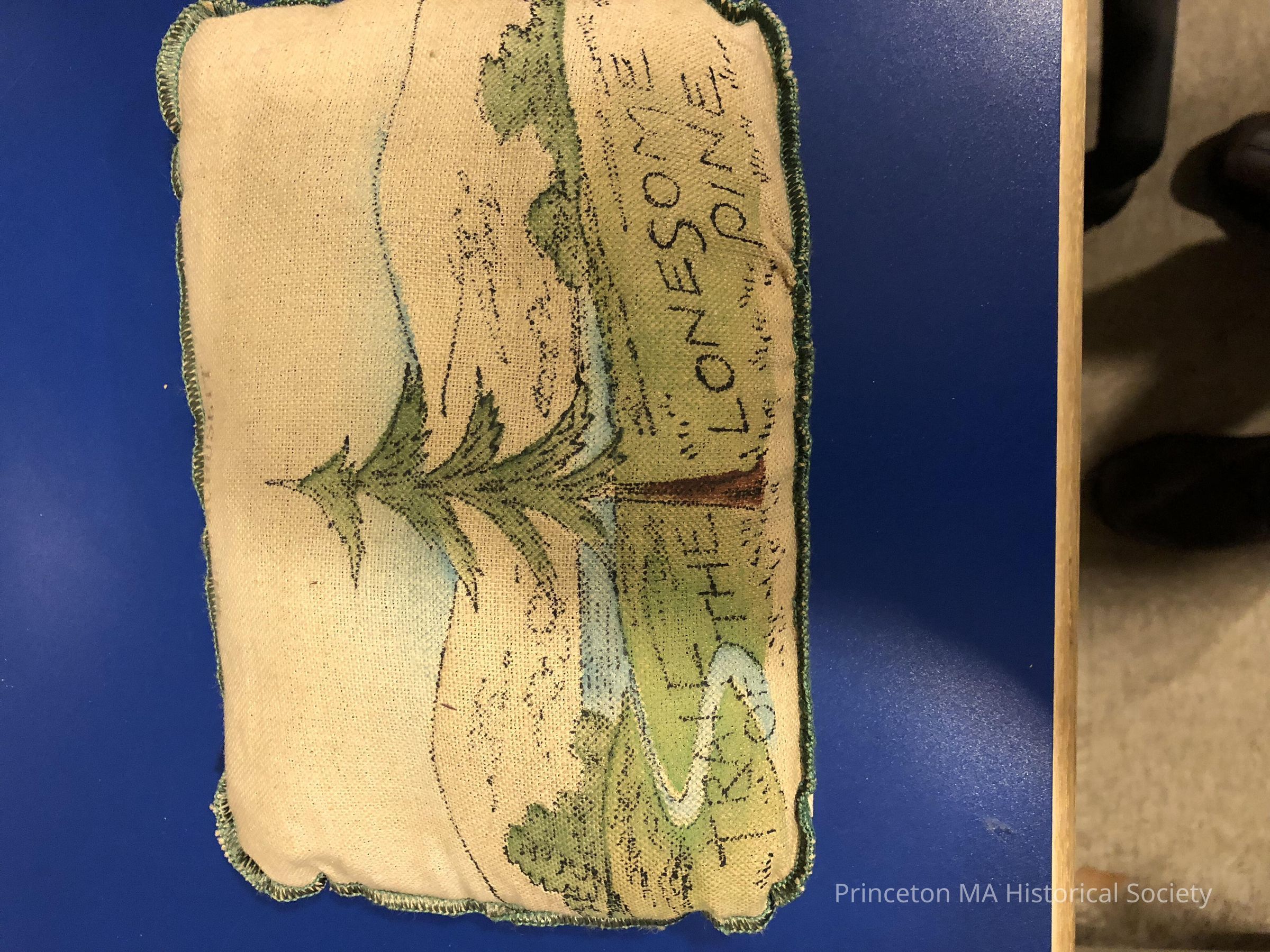 Balsam gray and green pillow marked MT. WACHUSETT trail of the Lonesome Pine.Location