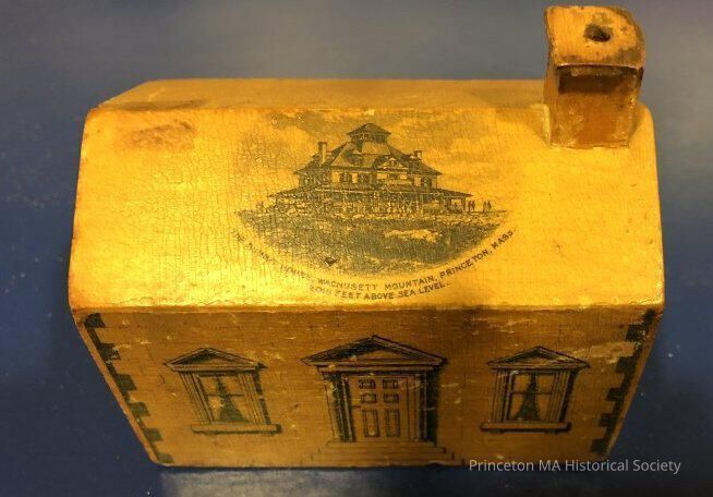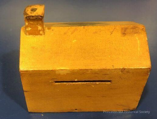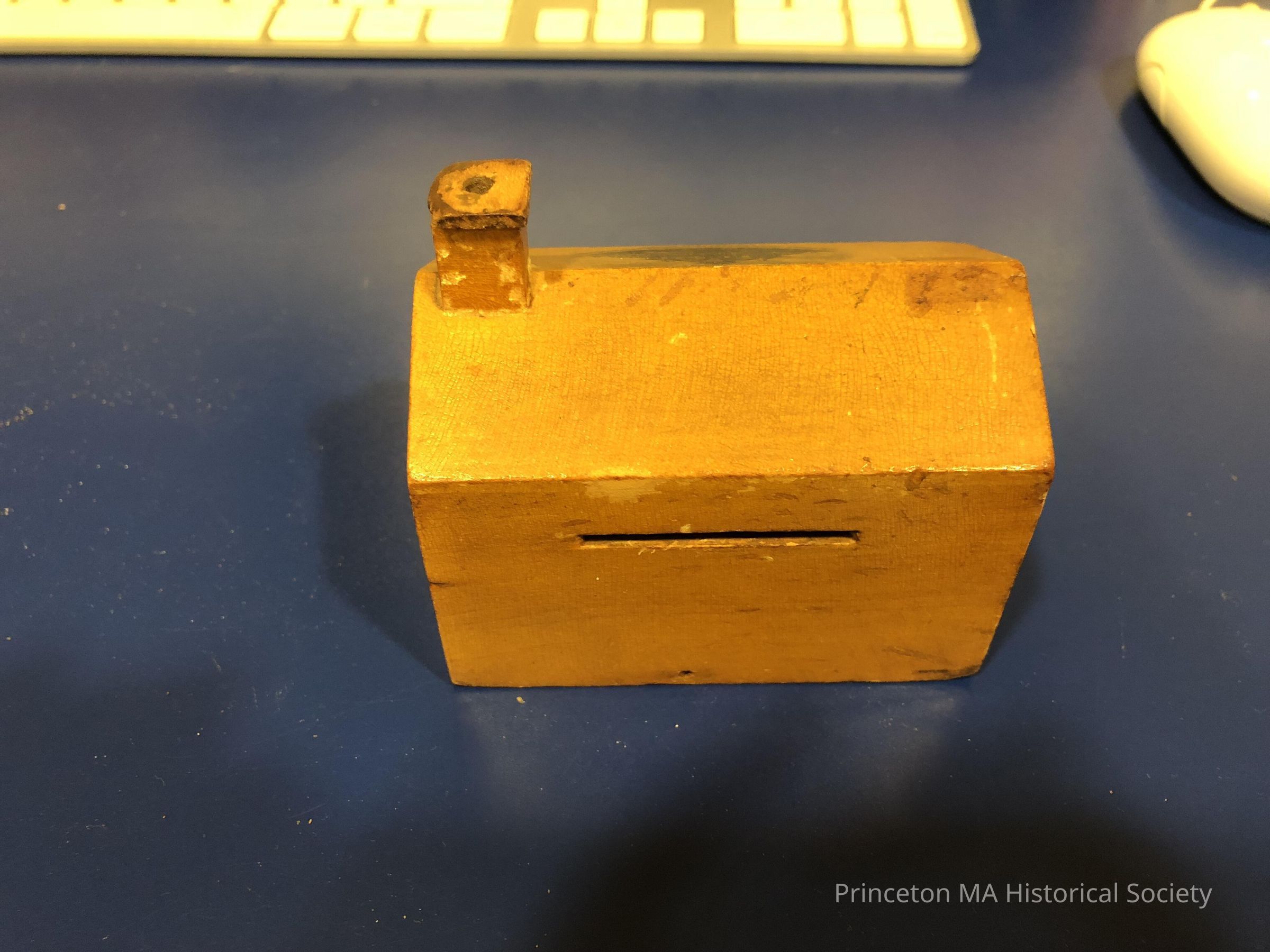Mauchlin small wooden bank depicteding The Summit House (number 3) , a door and two windows on the front. It has a small lever on the bottom to access insideLocation