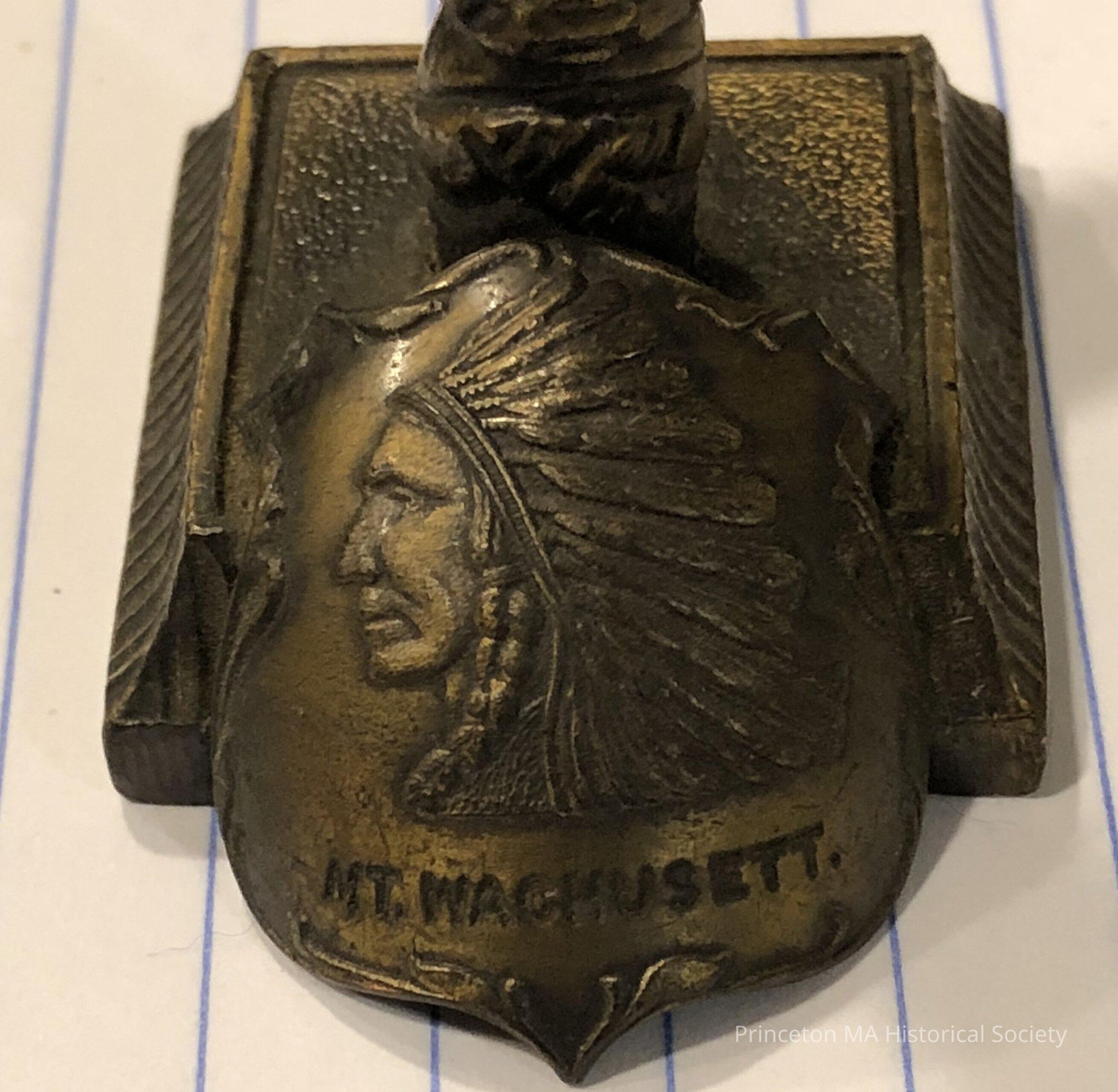 Metal Totem Pole with Indian in full headdress marked Mt. WachusettLocation