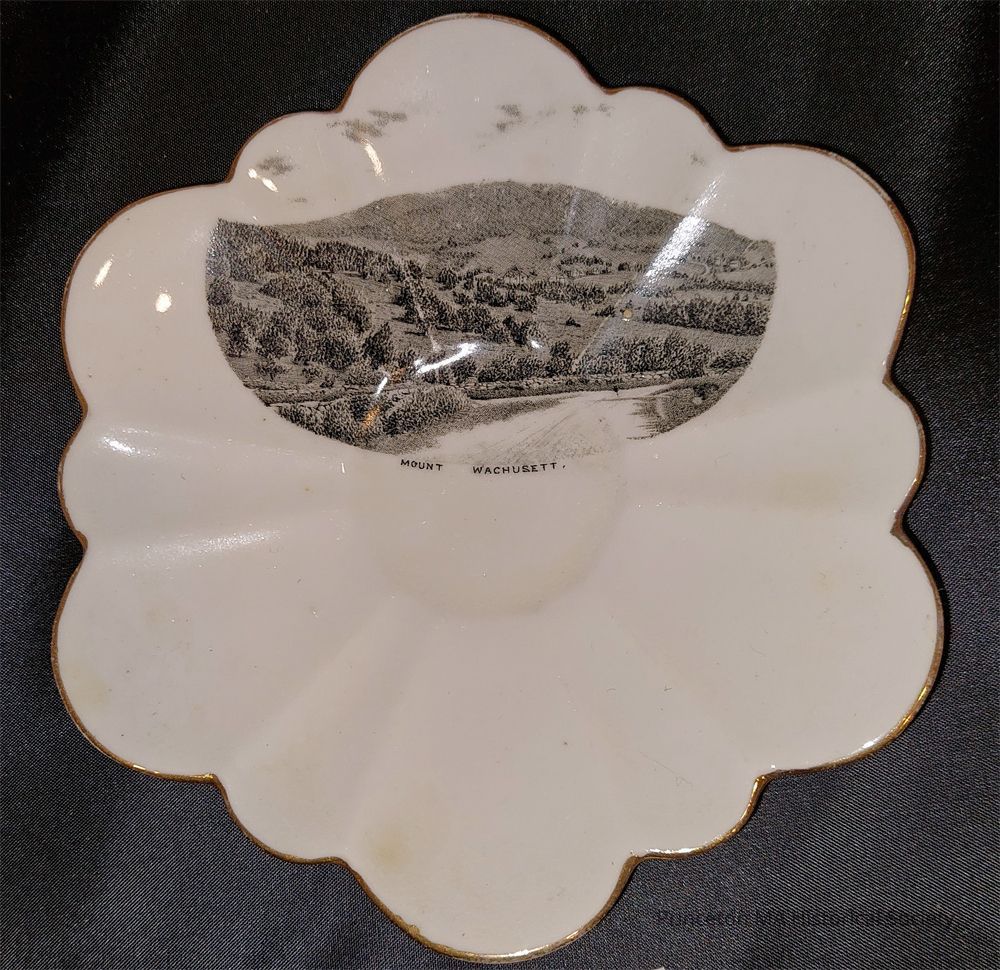 Small Plate with hand painted B&W view of Wachusett Mt. from Mountain Rd. Scalloped plate with image at top of plate.