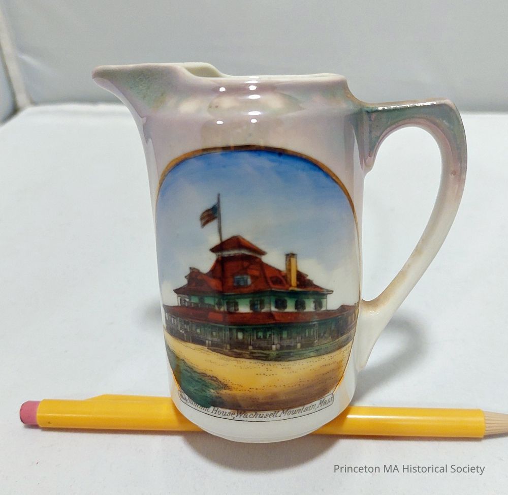 Small Pitcher with hand painted color image of the Third Summit House - gray blue top.