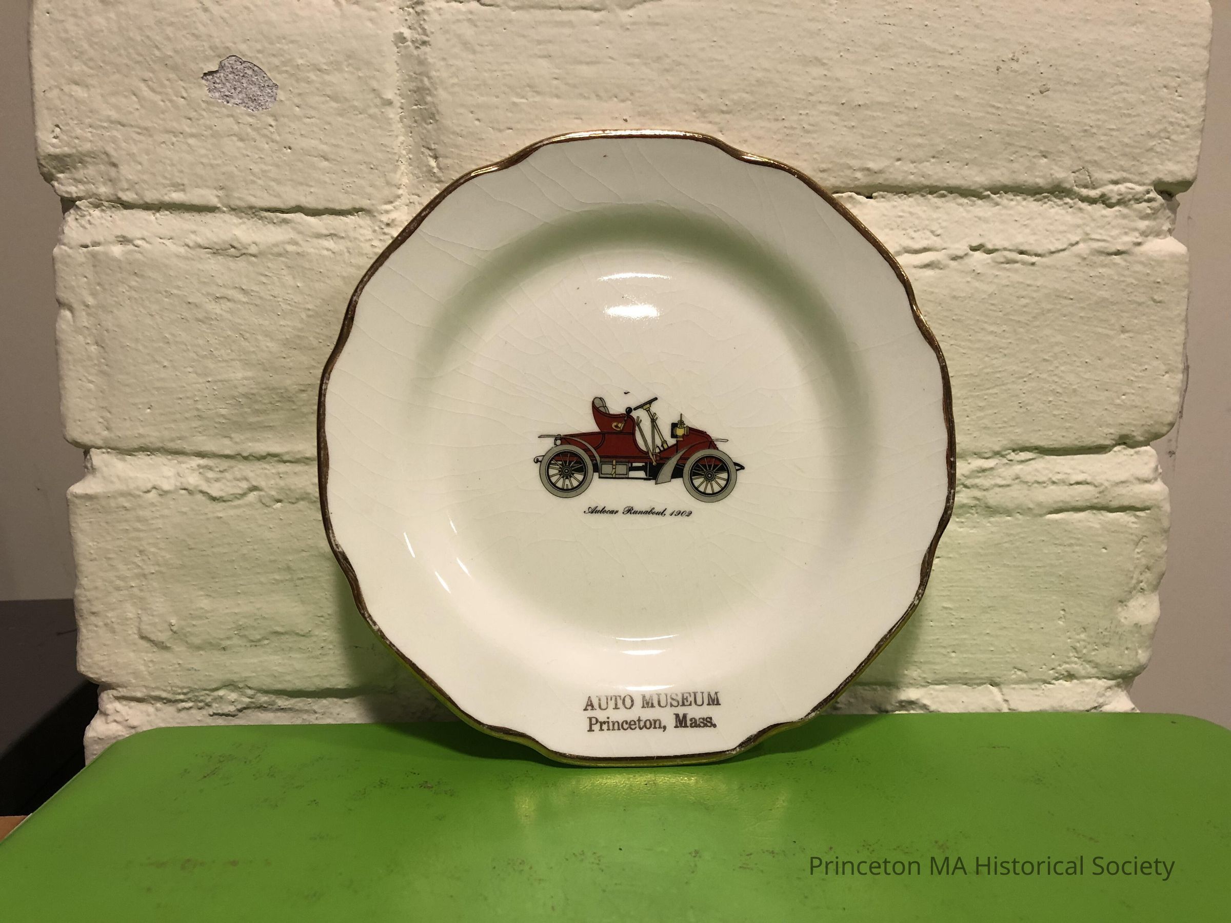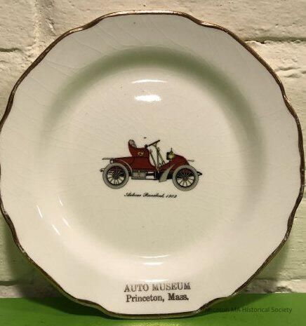 This is a small souvenir plate. There is a picture of an "Autocar Runabout 1902" and the words "Auto Museum, Princeton, Mass." A thin band of gold goes around the edge, which is slightly scalloped. On the reverse is "The "Sabina" line warranted 22 k."