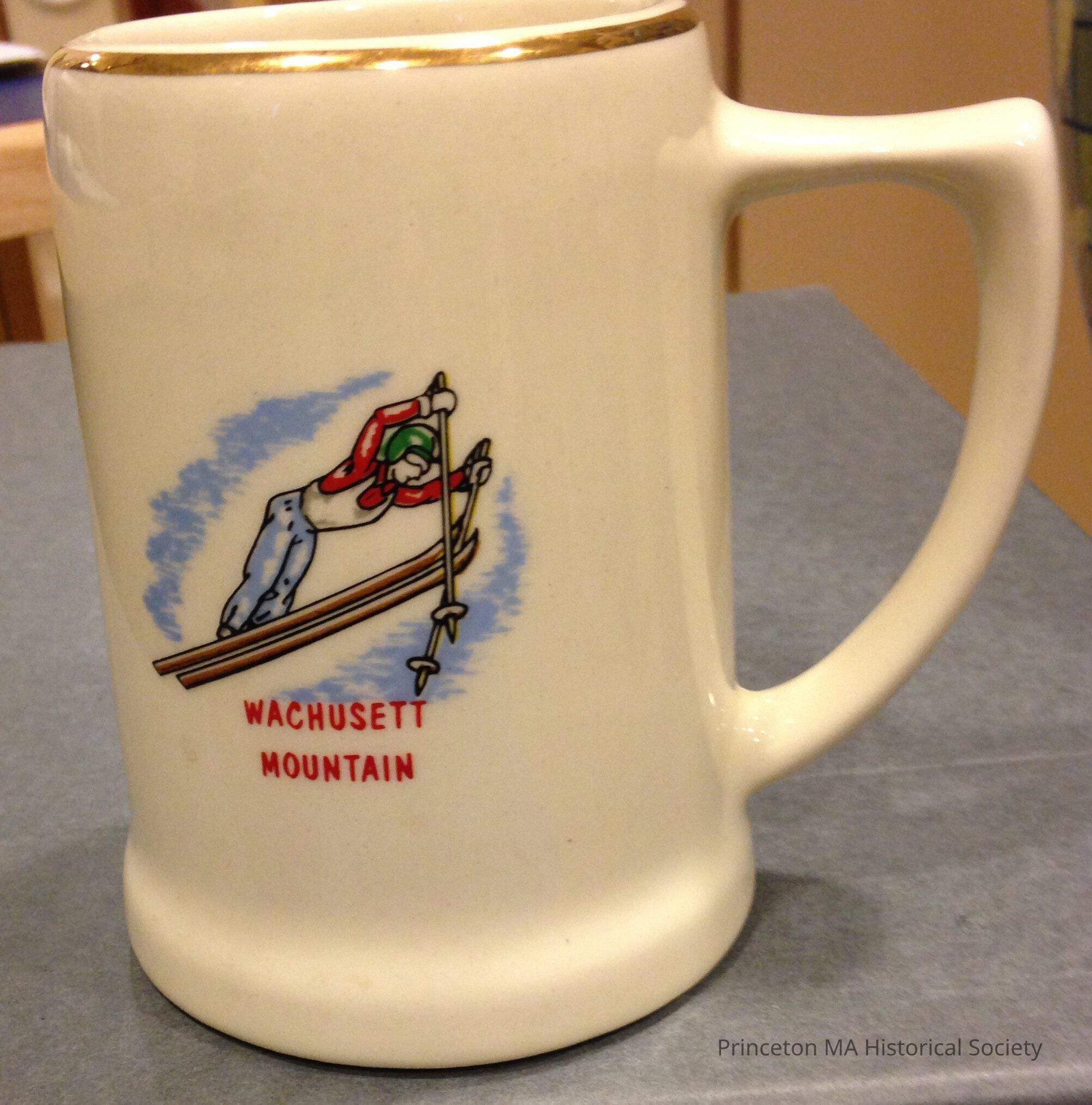 This is a heavy ceramic mug with a decal of a skier pushing off, as if at a ski jump. The figure is blue pants, red top with white bib. Below figure the words "Wachusett Mountain in red. Gold line around rim.Location