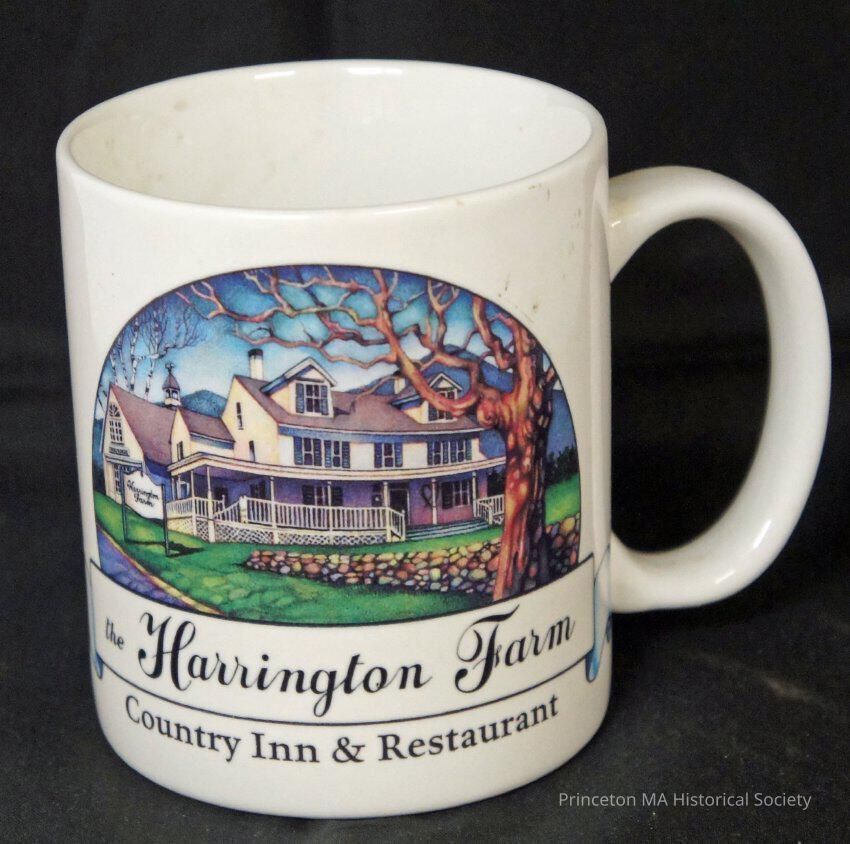 This is a souvenir mug from "Harrington Farm Country Inn." It is white with a picture of farm.