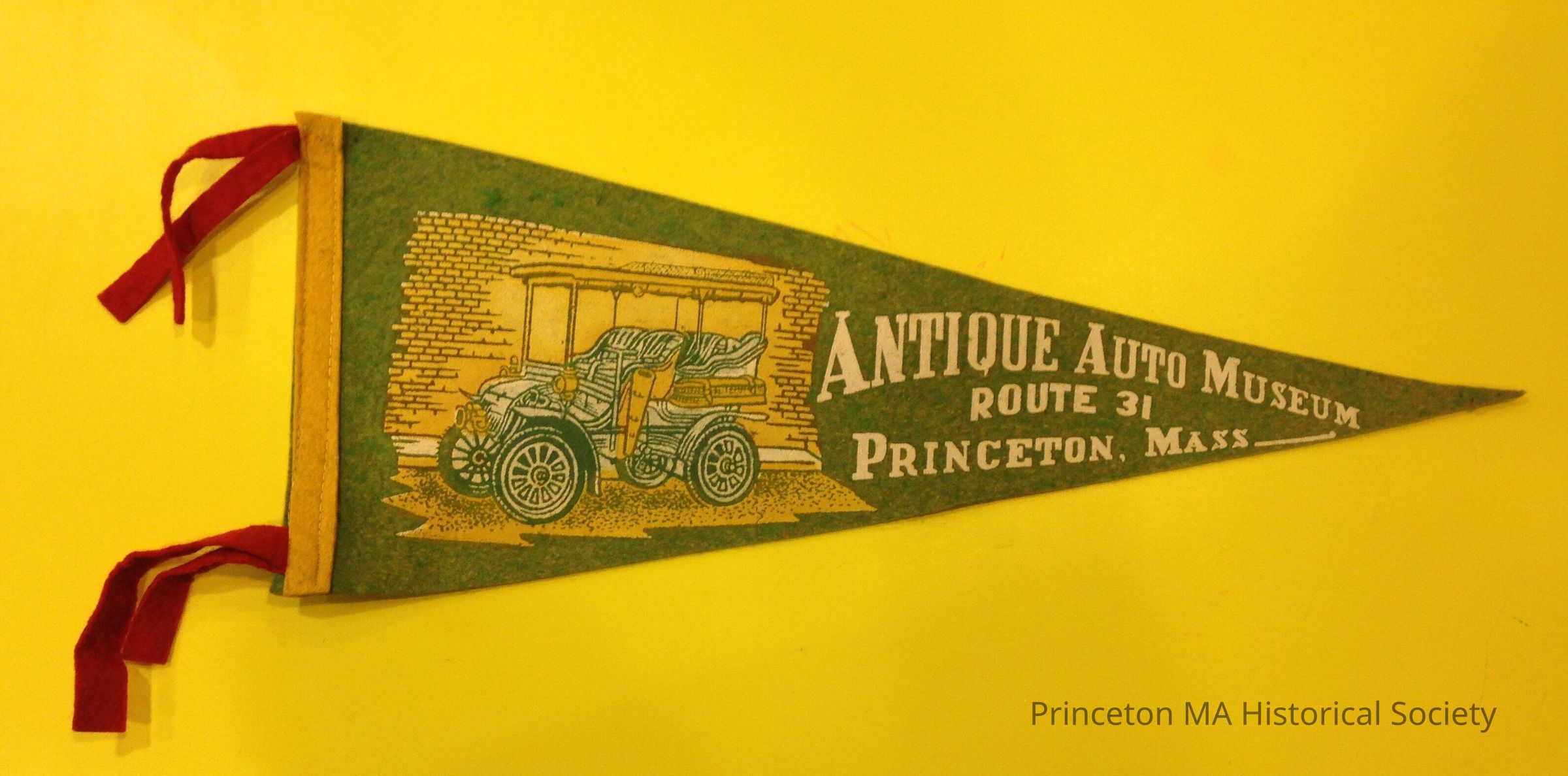 This is a felt pennant from the auto museum. It say "Antique Auto Museum, Route 31, Princeton, Mass." The background is pale green, with white lettering. In a yellow area is a picture of an antique car. The pennant has red felt ties.