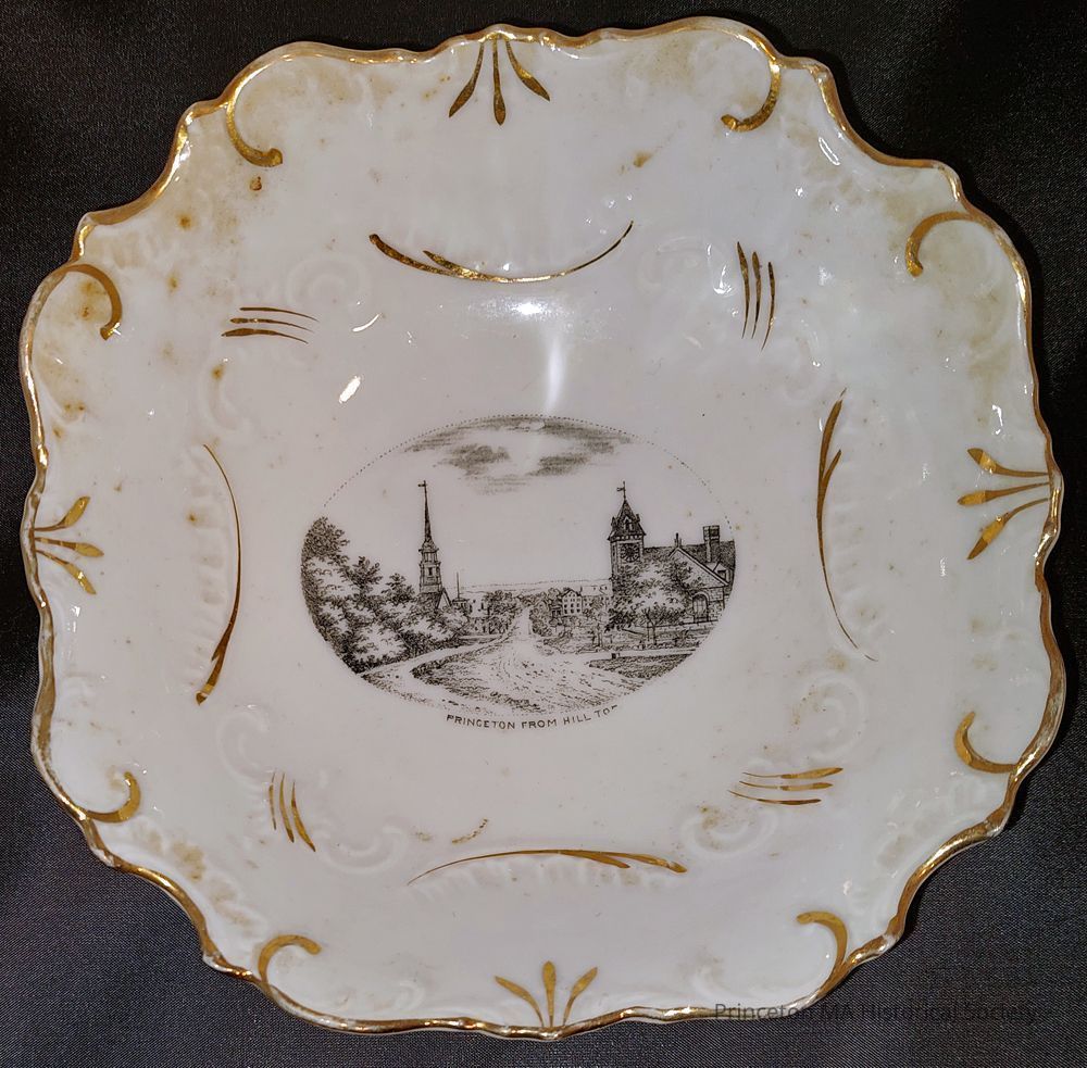 Small bowl with hand painted B&W small image of Princeton Center from the North Hill Top - edges appear to be gold leafed.