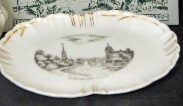 This a china souvenir dish with a black and white view of Princeton center. It is an oval dish with a scalloped edge with traces of gold. On the back "Made in Germany" "D H Gregory & Co, Princeton Mass."Location