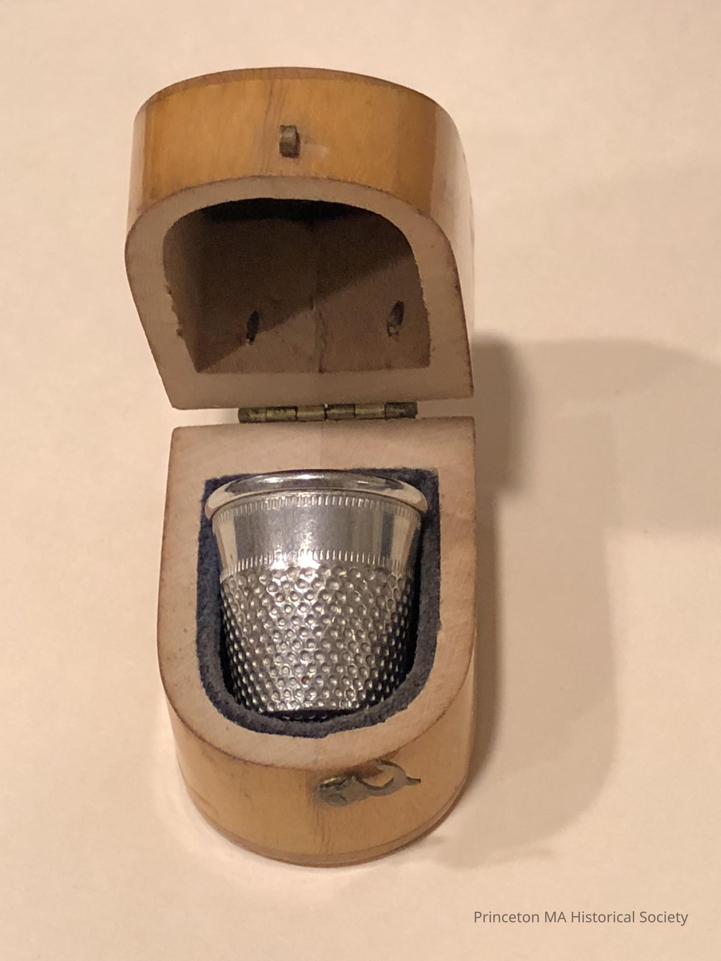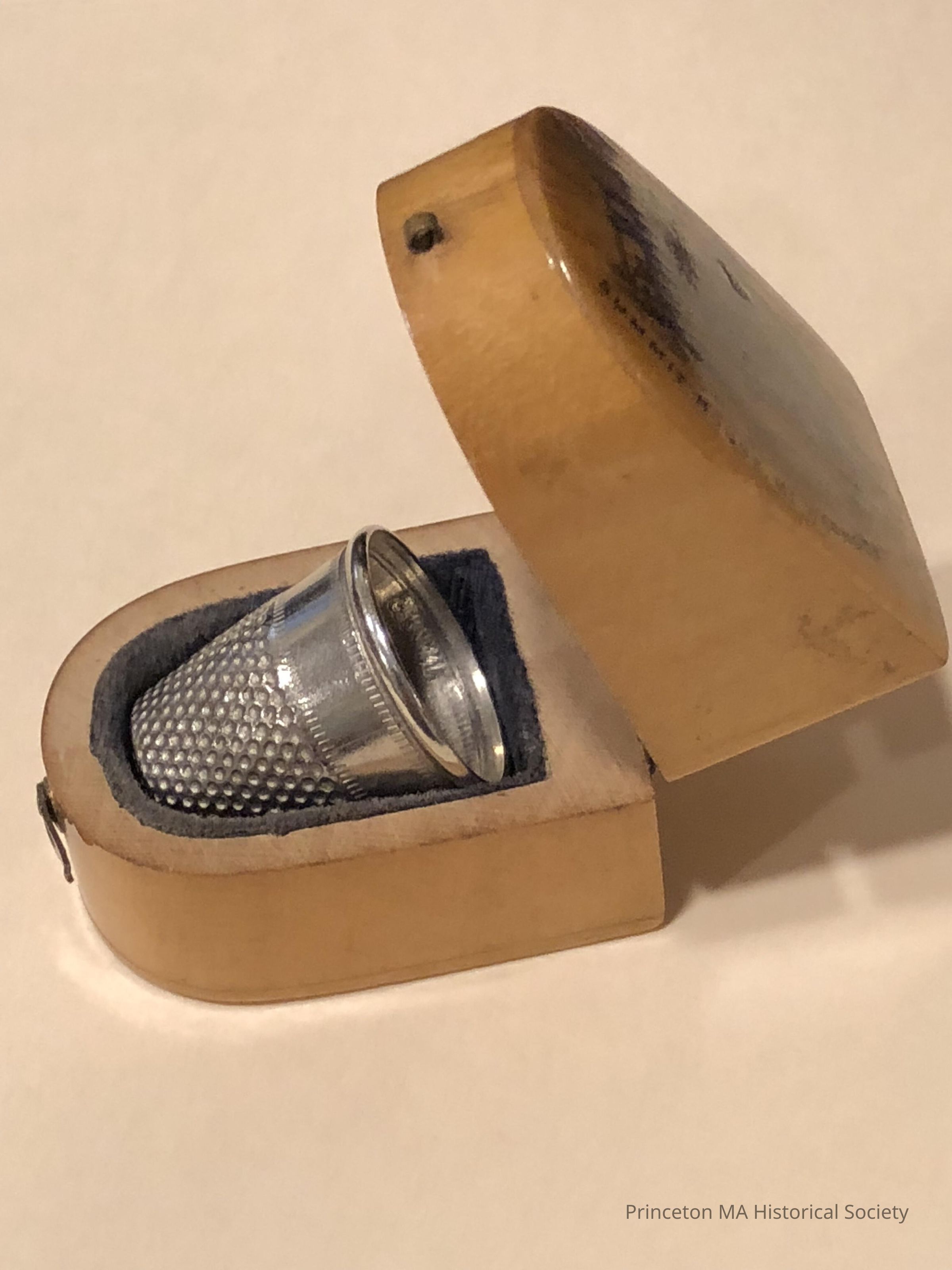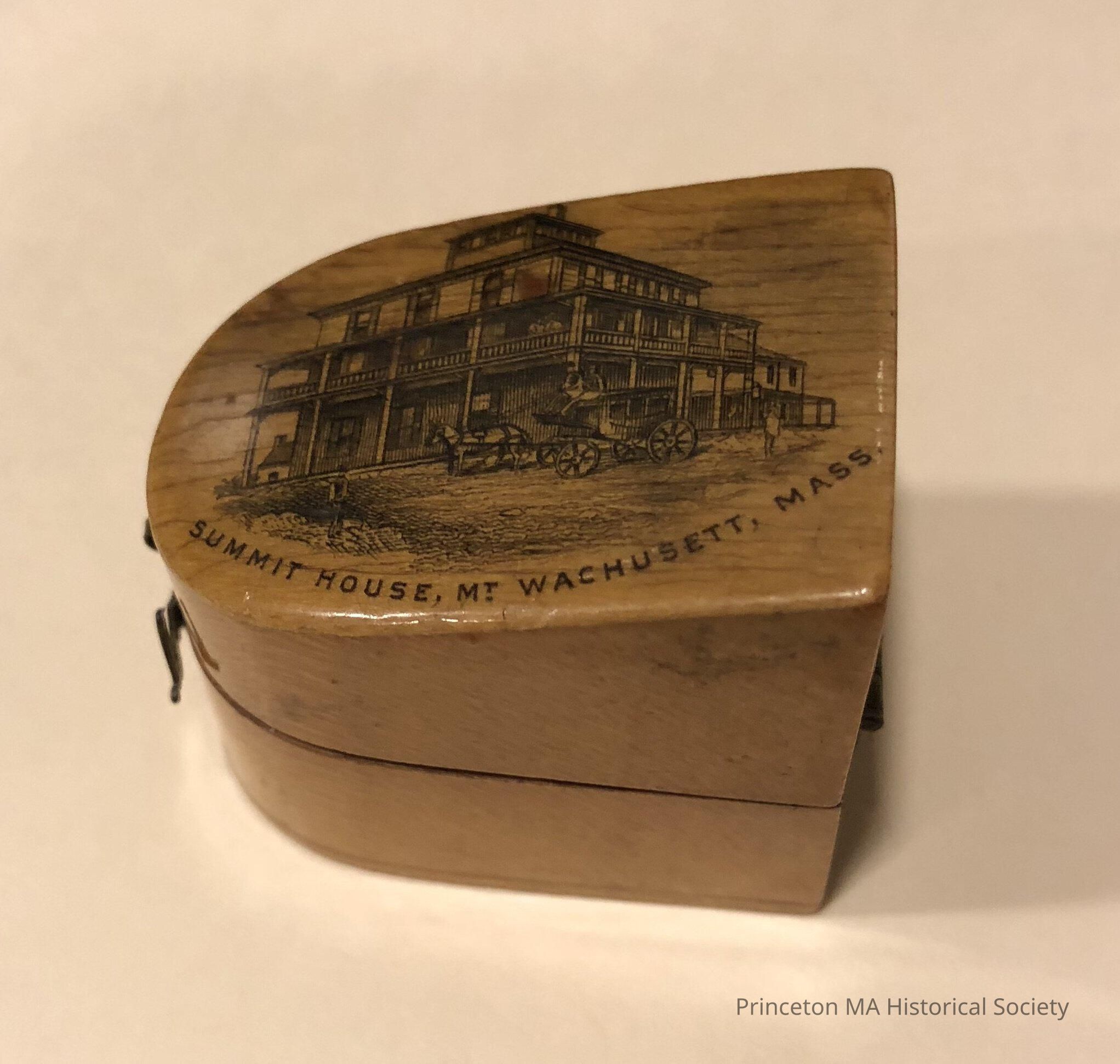 Wooden Souvenir showing Wachusett Summit House number two. Mauchline Ware. Wooden thimble holder with a felt lining and a small clasp.Location
