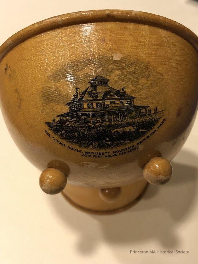 Mauchline Ware Souveniers depicting Wachusett Mountain House number three. Small wooden bowl with three round ball legs.