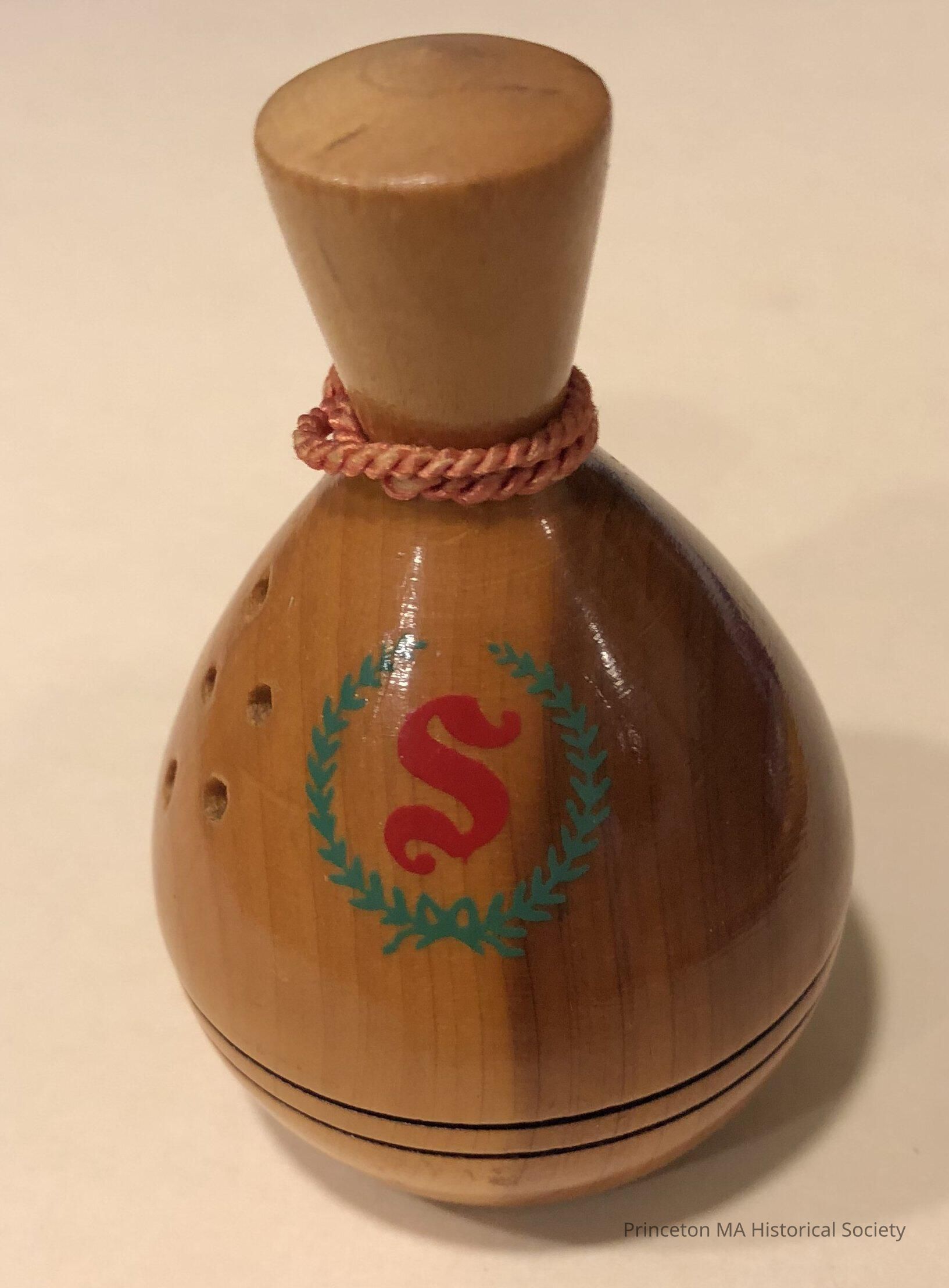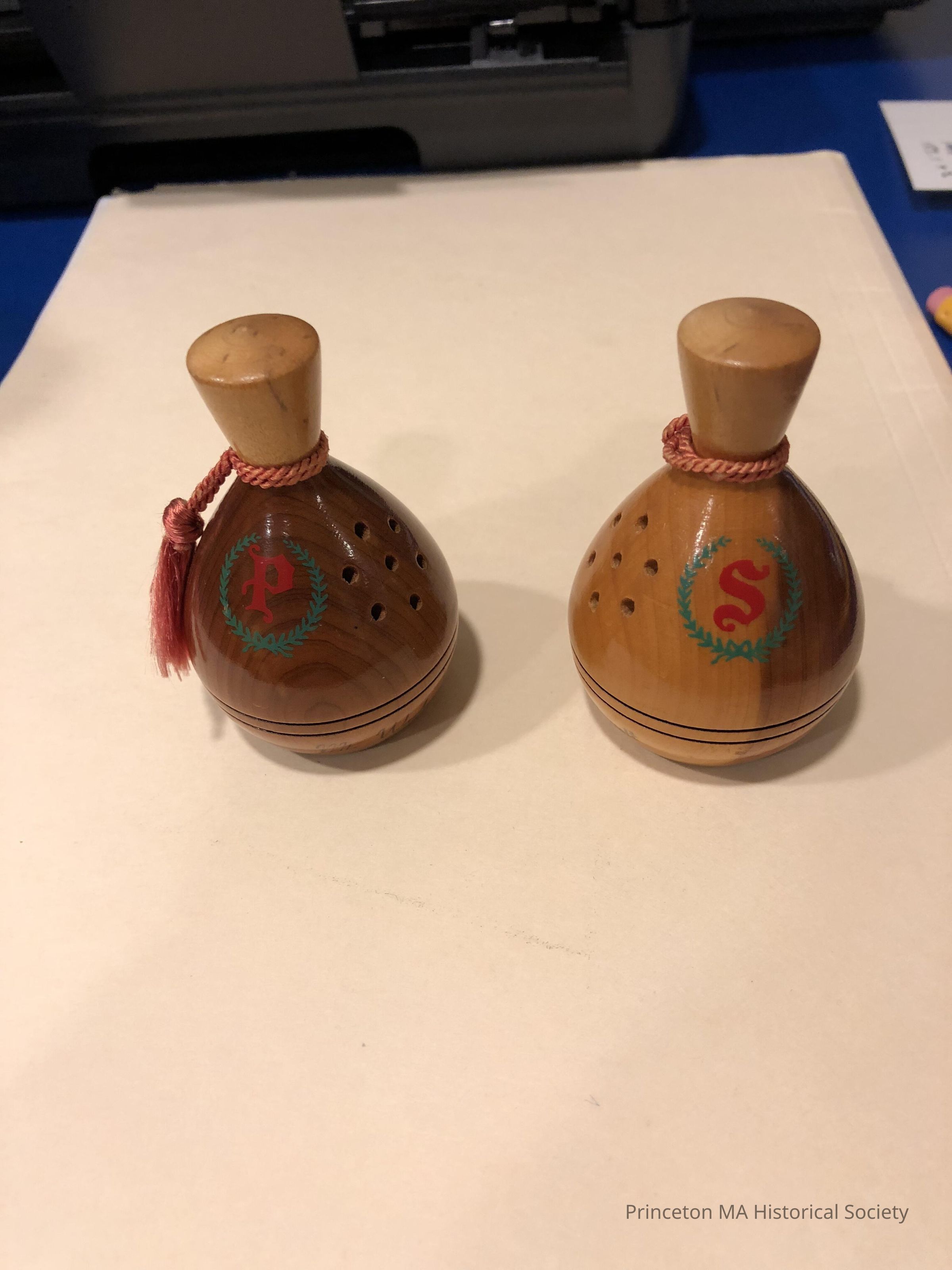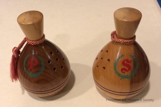 Mauchline Ware Souveniers mark Mt. Wachusett. Salt and Pepper shaker marked with a red 'S'. Adorned with a small red rope