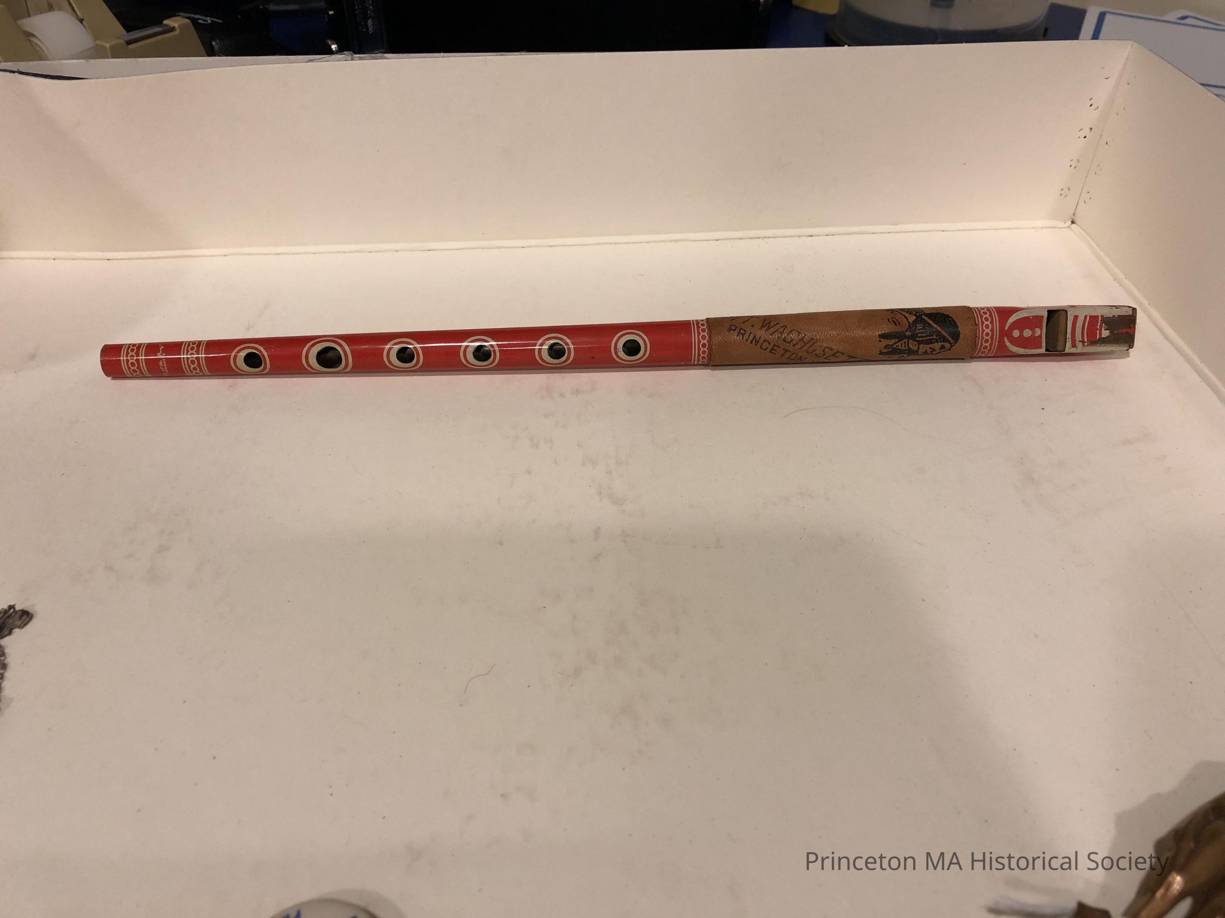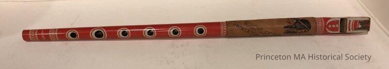 Red Tin flute with a wooden reed, marked life of the party products. Wrapped with leather swatch depicted an Indian marked Mt. Wachusett Princeton.Location