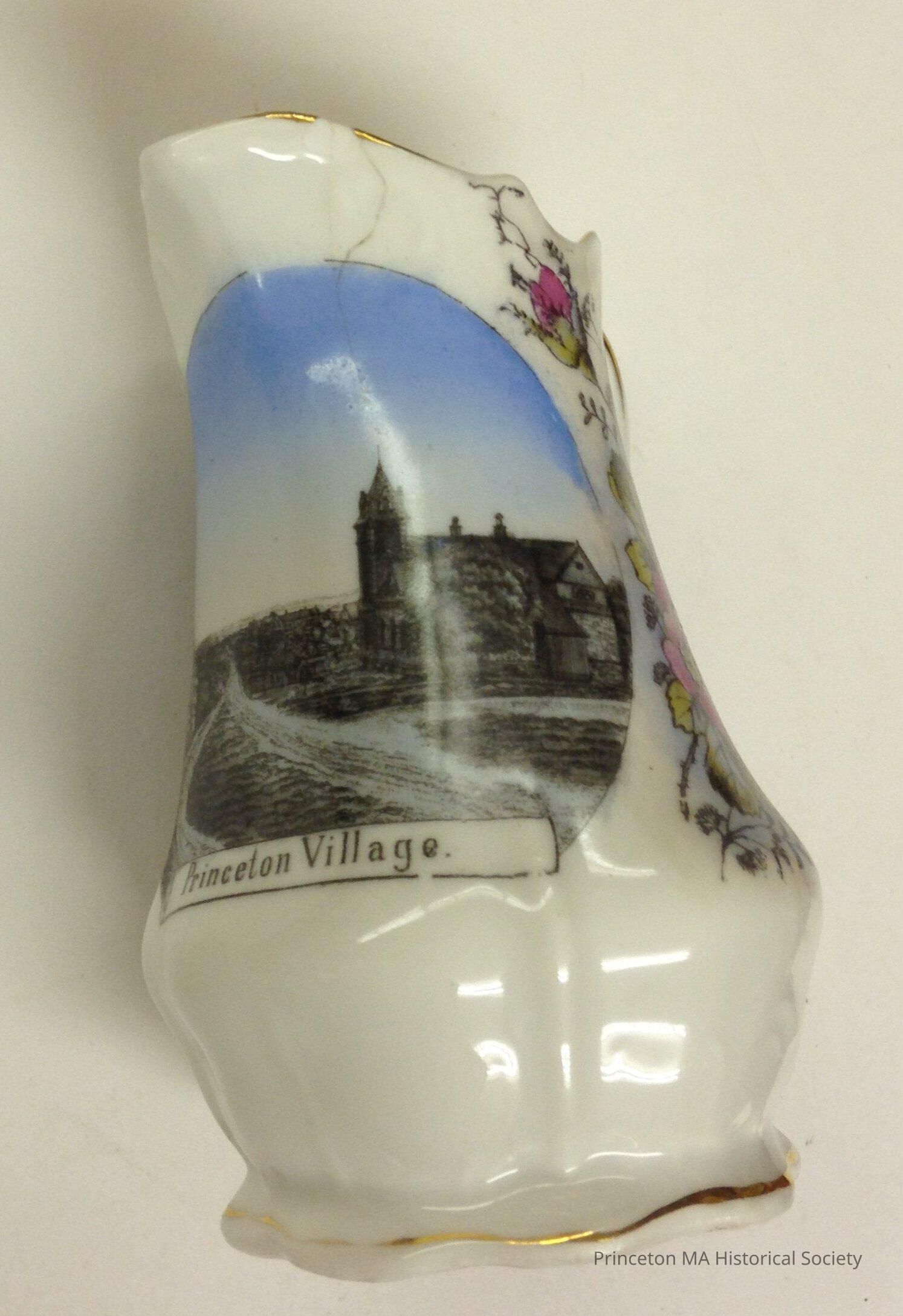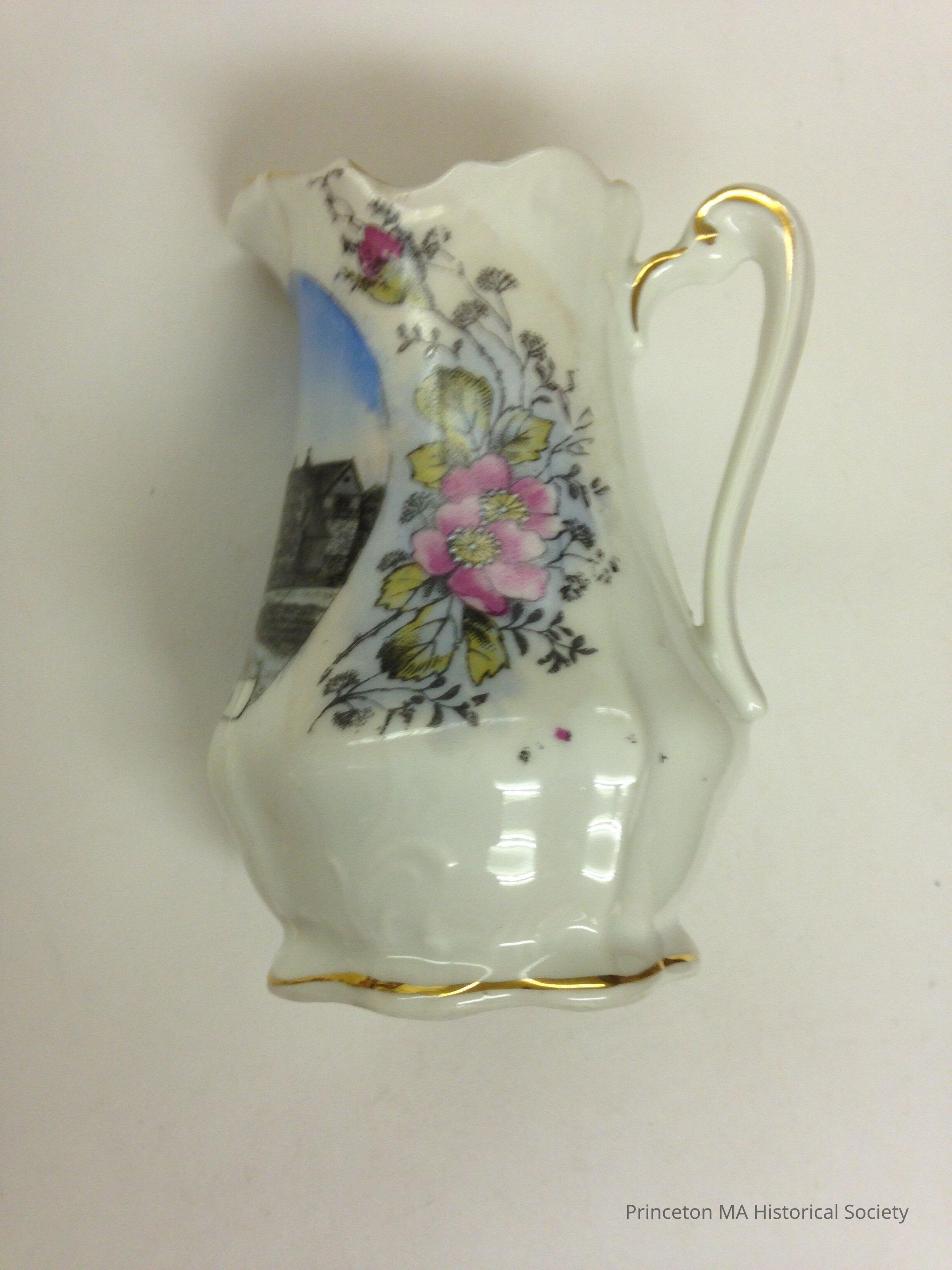 This is a small pitcher with a picture showing library, church, Wachusett House, store labeled Princeton Village. Wild roses surround the picture.