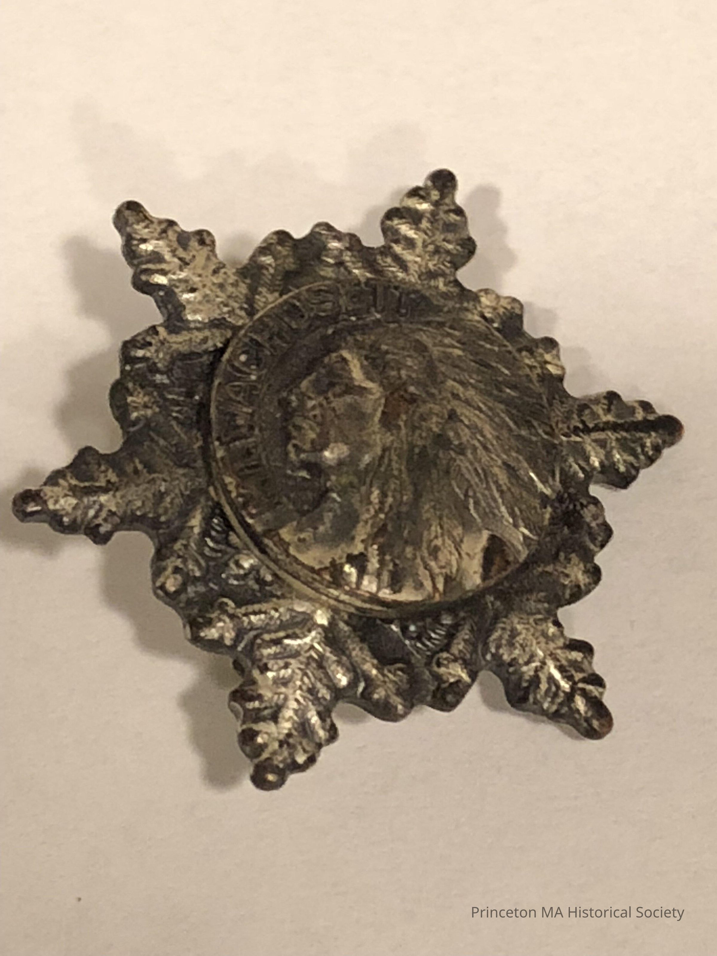 Small pin shaped like a snowflake depicting an Indian in full headdress marked Mt. Wachusett