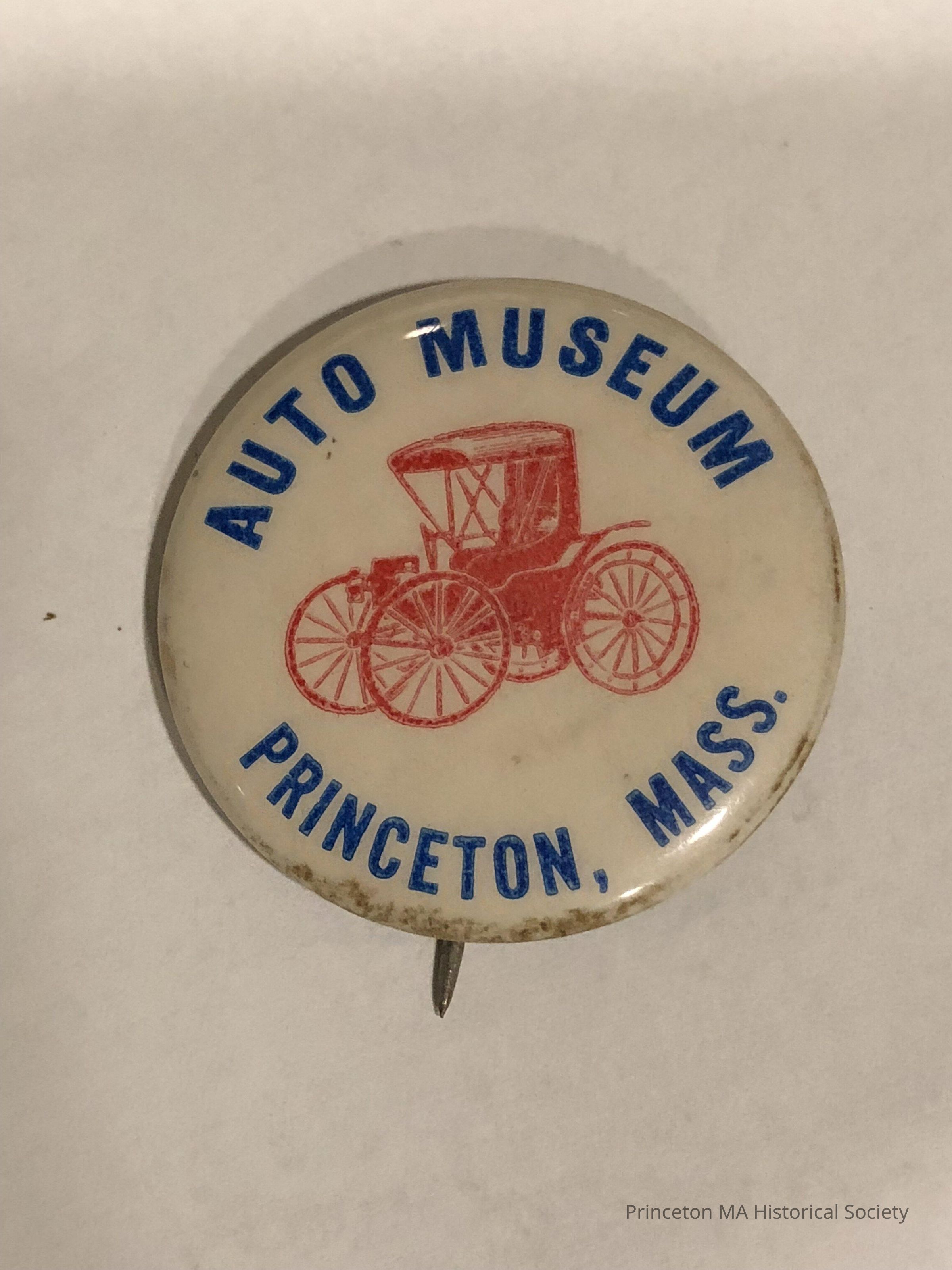 White Auto Museum pin. Depicting an old car in red. Marked, Auto Museum Princton, MASS on the front and Russell mfg. Co. Wakefield, Mass. on the backLocation