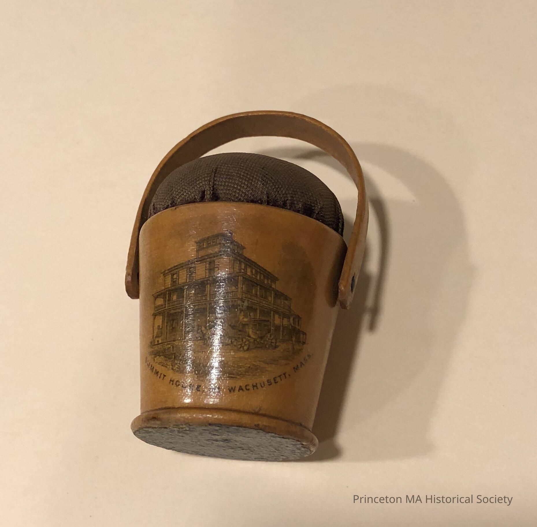 Wooden Souvenir showing Wachusett Summit House number two. Mauchline Ware. Small wooden pin cushion in a pail.Location