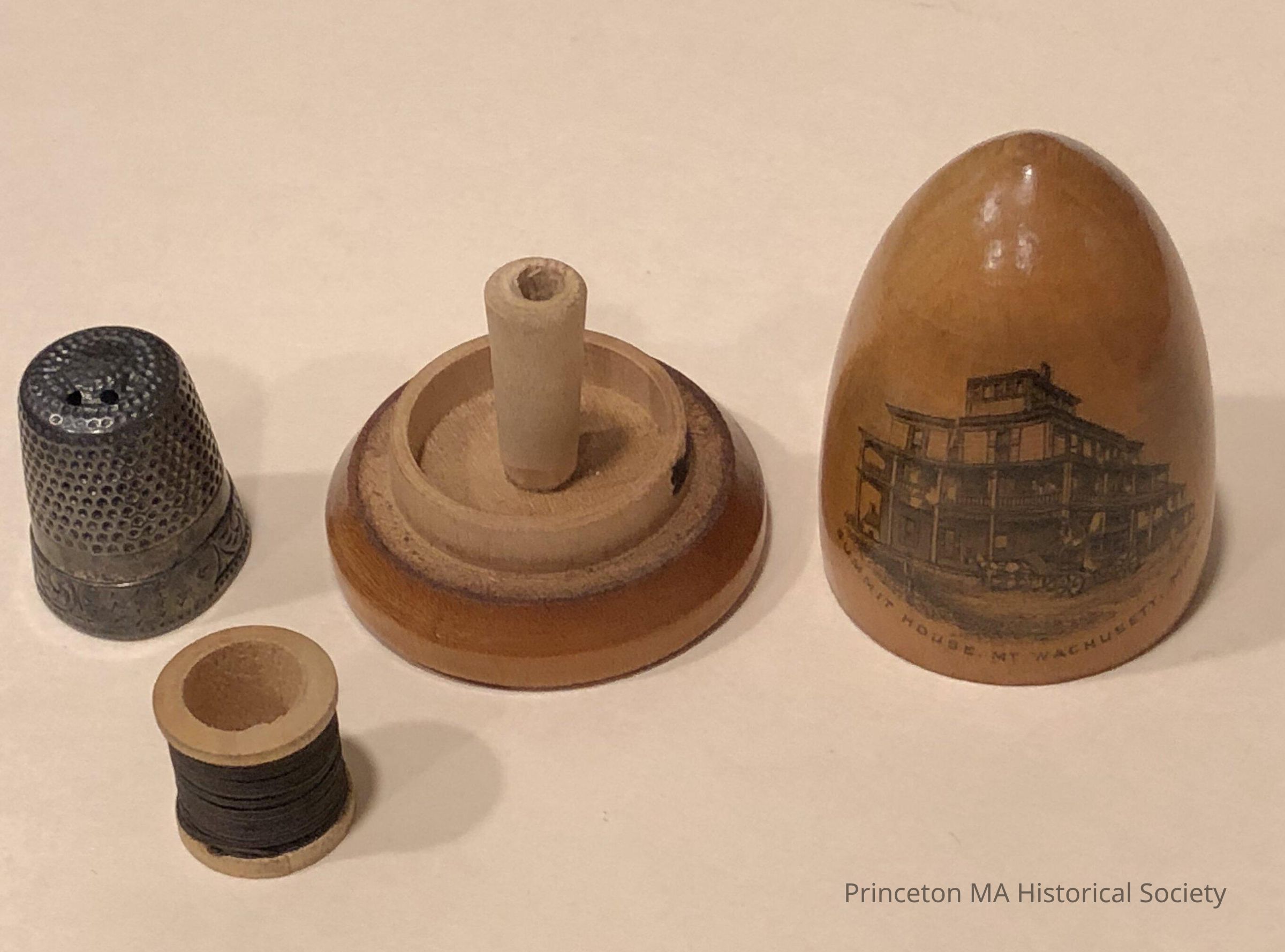 Part of Wooden Souvenir showing Wachusett Summit House number two. Mauchline Ware. Small silver thimble which sits inside thimble holder. Marked Sterling with a small star on the insideLocation