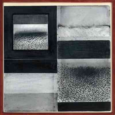 Four squares of black and white dune/ocean scenes