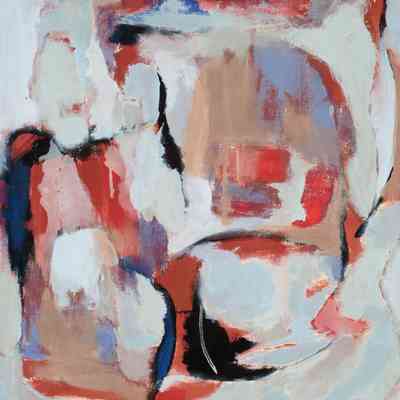 Mostly white with red and blue abstract strokes