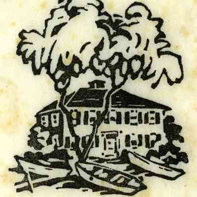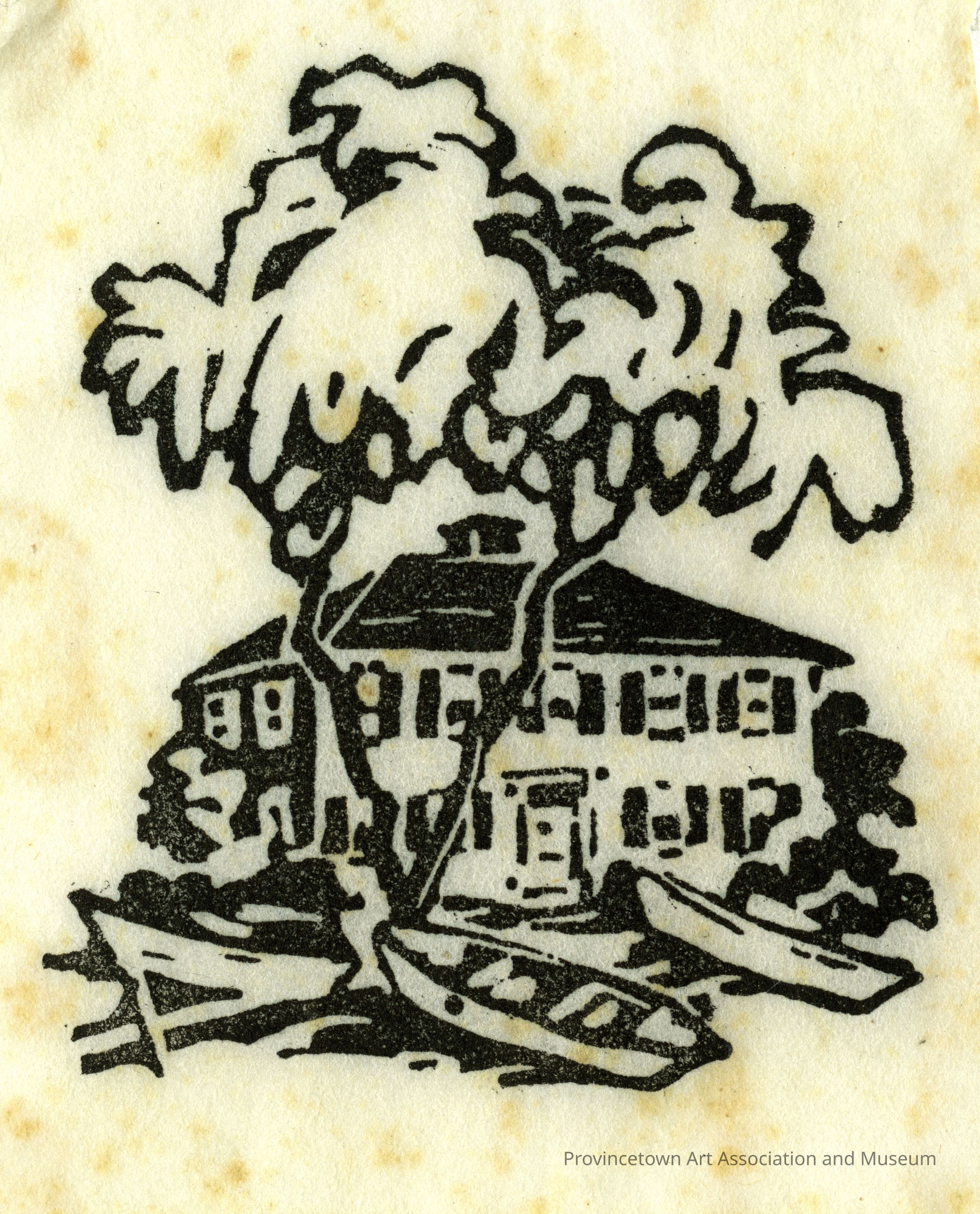 Black and white print of the old PAAM building (historic house) with large tree and dories in front