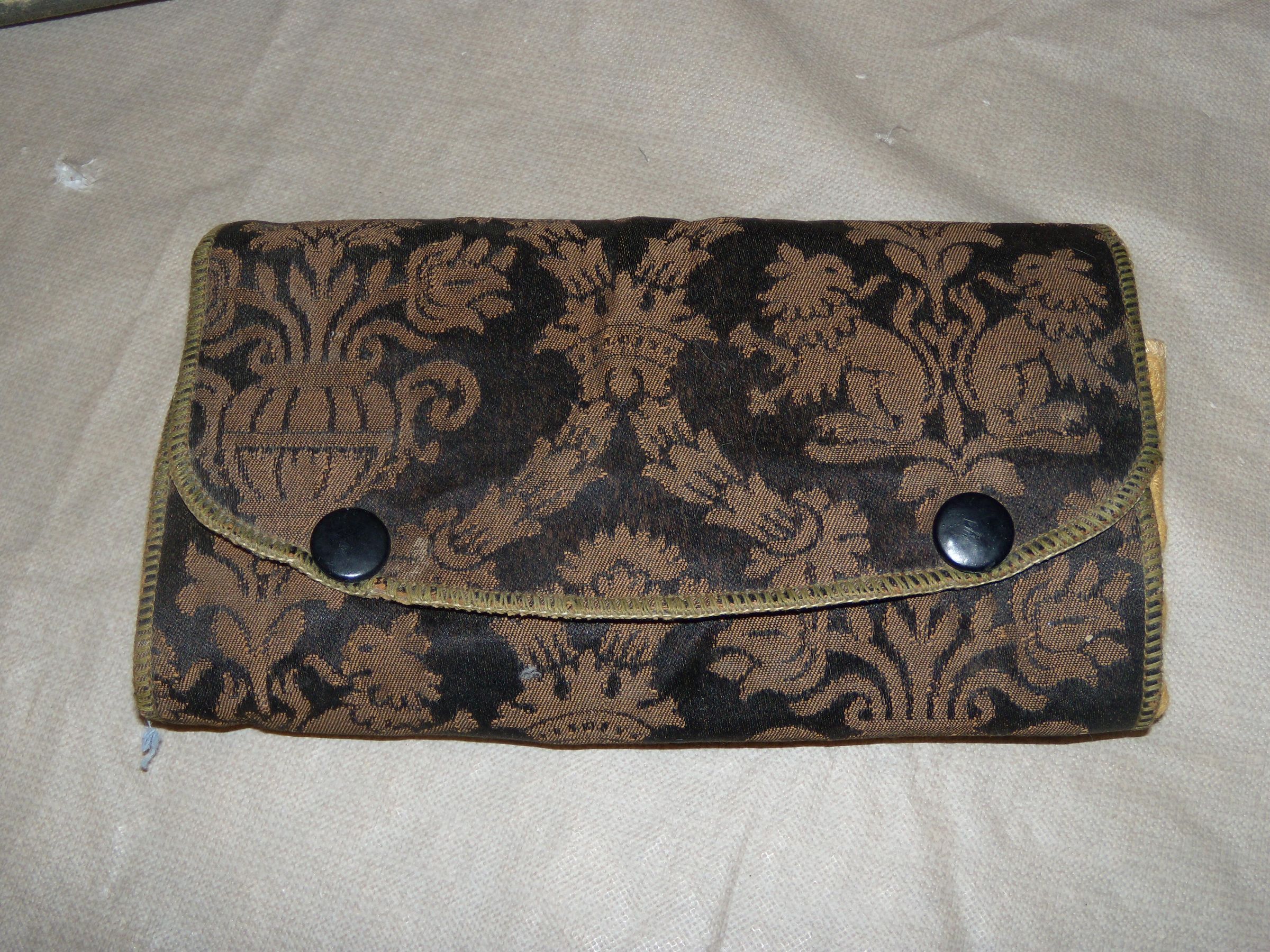 Instrument case, fabric, for nurses, with 8 instruments, scissors, file, scalpels. Black and brown brocade outside and gold brocade inside. Folded over size is 3.5 in x 6.0 in.Collection