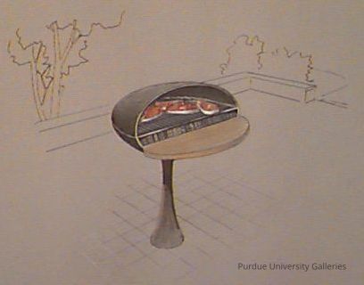 oblong sphere grill with flat open end and wooden shelf. "Gas grill" written on firebox above wood shelf.Acquisition