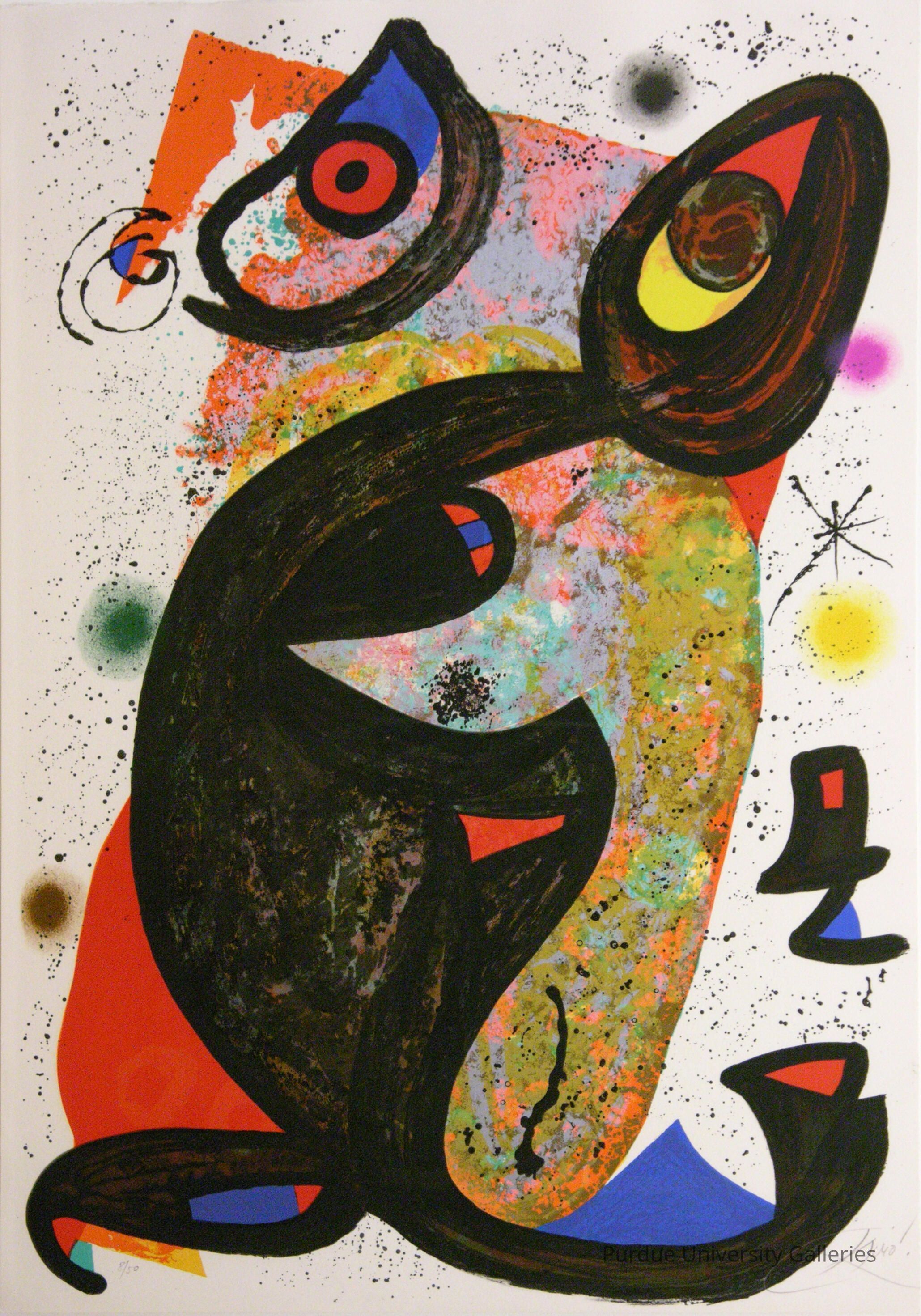 Miró formulated a complex system of calligraphic symbols abstracted from nature, distilled from primitive art forms and drawn from the myths and fables of his Catalonian childhood that allow for a certain amount of interpretation but also have elements of exact meaning. His organic shapes in flat, pure color seem to float or dance against vast empty spaces so that even when his themes are sombre in content his pictographic style, reminiscent of Oriental ideographs, has a quality of fantasy and a playful vitality. Miró's poetic visions have influenced the work of Alexander Calder, Jackson Pollock, Arshile Gorky and Robert Motherwell."