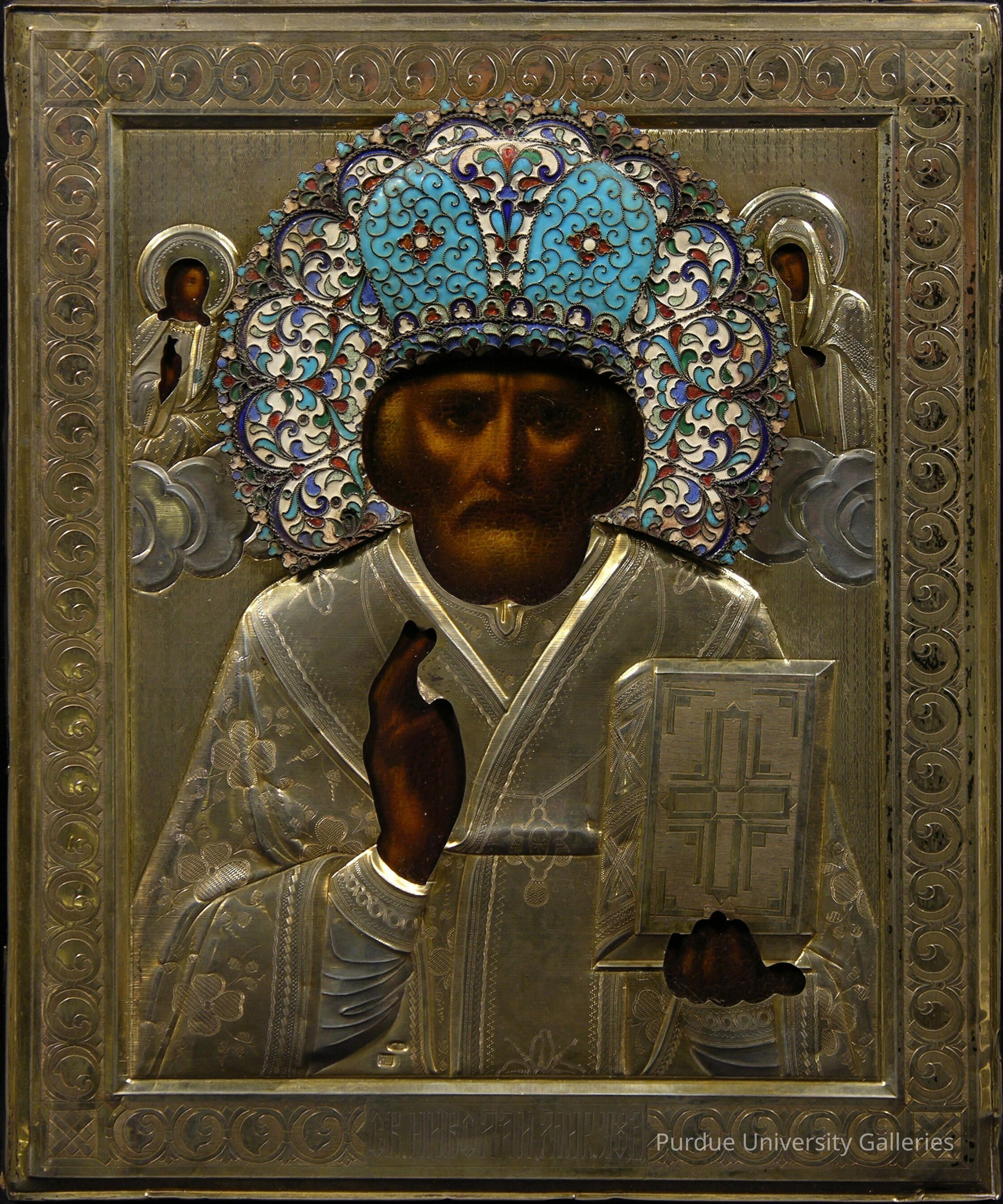 For the biography of St. Nicholas, please see 2005.02.066. St. Nicholas makes a benediction with one hand and holds a Bible in the other. The riza shows him wearing a flowered dalmatic and a panagia necklace with a sparsely decorated stole. By contrast, the painting depicts him in a plain dalmatic without a necklace and a single cross on the orange stole. The background of the painting remains unadorned while the riza is detailed. The varnish-darkened faces of St. Nicholas, Christ, and the Virgin Mary contrast with their brightly decorated cloisonné haloes, which appear unaffected by age. The cloisonné mitre is colorful and ornate, but the painted mitre is red with a dark red oblong on the front. The western-influenced painting figure style displays softened and realistically rendered features. The clouds and borders of the riza remain silver while the rest of the riza has been gilded, adding an element of interest to the icon not present in the painting underneath.