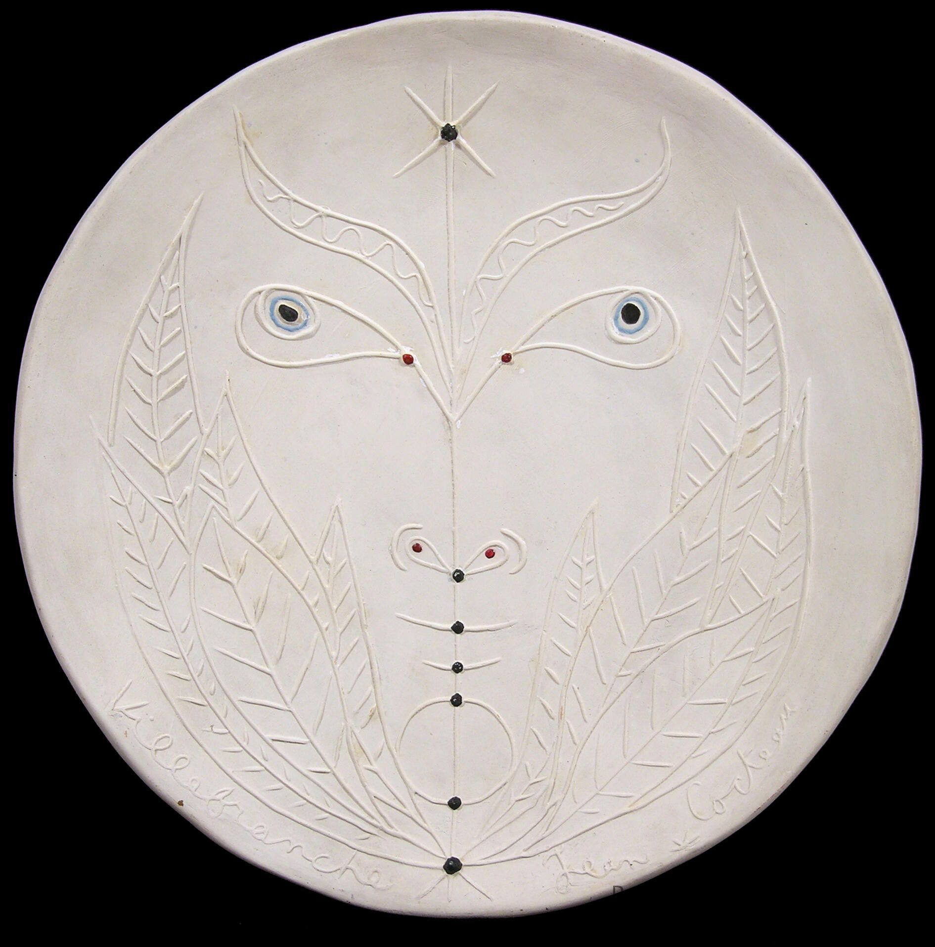 Cocteau moved from Paris to the French Rivera following World War II. There in 1956 he began an ambitious, multi-year project redecorating the 14th century Chapelle Saint-Pierre at Villefranche-sur-Mer, covering the interior and exterior with intricate murals. At the same time, he began to collaborate with local ceramicists Marie Madeleine Jolly and Philippe Madeleine, eventually producing over 300 designs in six years. These works highlight Coteau’s mature aesthetic with themes pulled from Classical mythology. Note the spare elegance of his work with its focus on symmetry using simple lines and touches of color.
