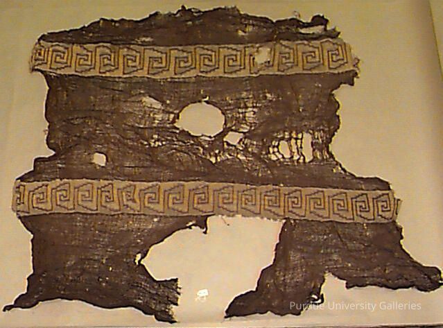 Fiber, alpaca, and cotton. Woven fragment of two bands, in tapestry weave, containing stylized interlocked frets connected to three sheer brown cotton plain weave panels. Colors include gold, yellow, red, and brown.Acquisition