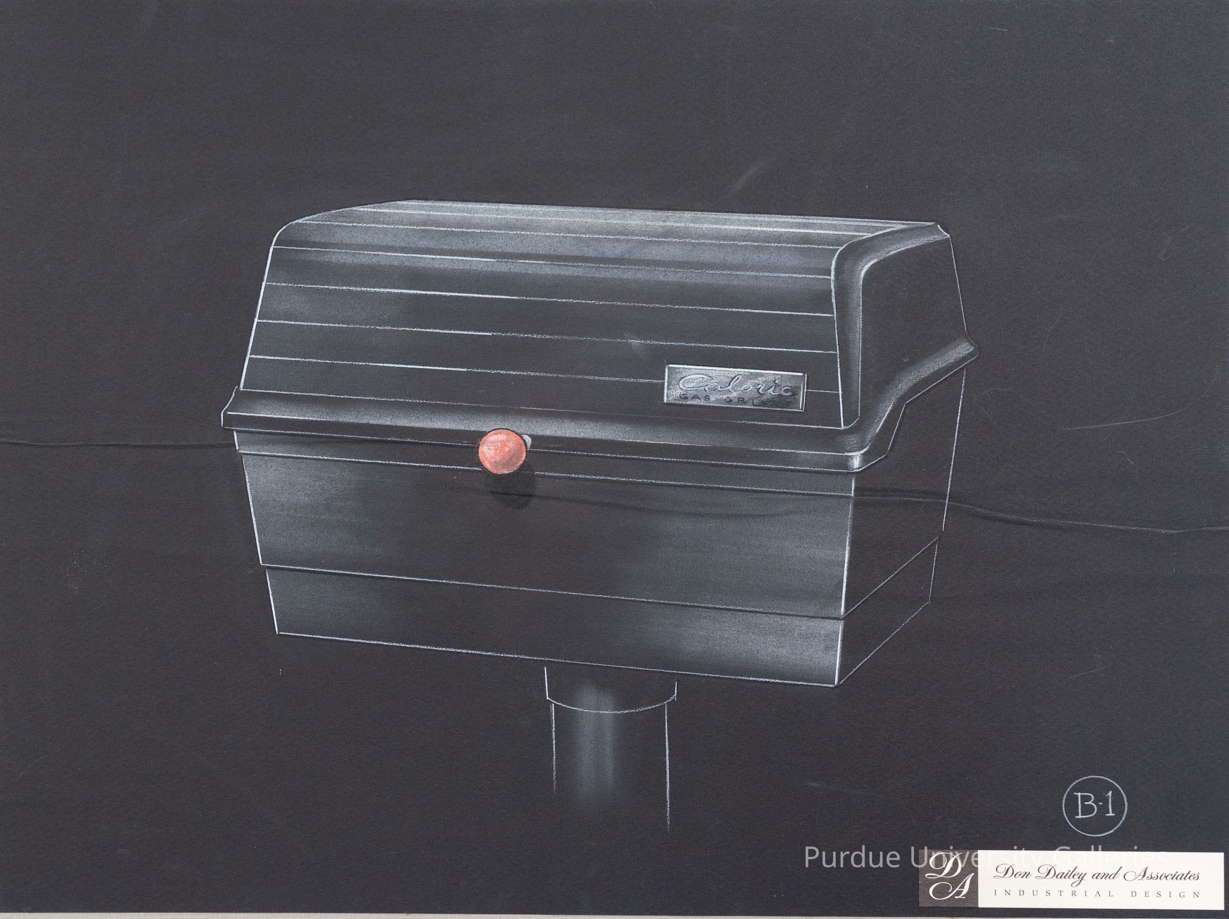 Drawing in white of a "Caloric GAS GRILLE" prototype with a red nob to open the lid. It was drawn on black paper glued onto a gray, faintly checkered cardboard display board. "B-1" is written in a circle located on the bottom right-hand corner of the black paper. Below that is a white and black sticker "Don Dailey and Associates" "INDUSTRIAL DESIGN". The back of the cardboard display board is white, and it has blue seals that say "Crescent CHARKO-BOARD" "Artist Charcoal Paper Surface" "No. 1002" "Mist Grey" "A PRODUCT OF CRESCENT CARDBOARD COMPANY".
