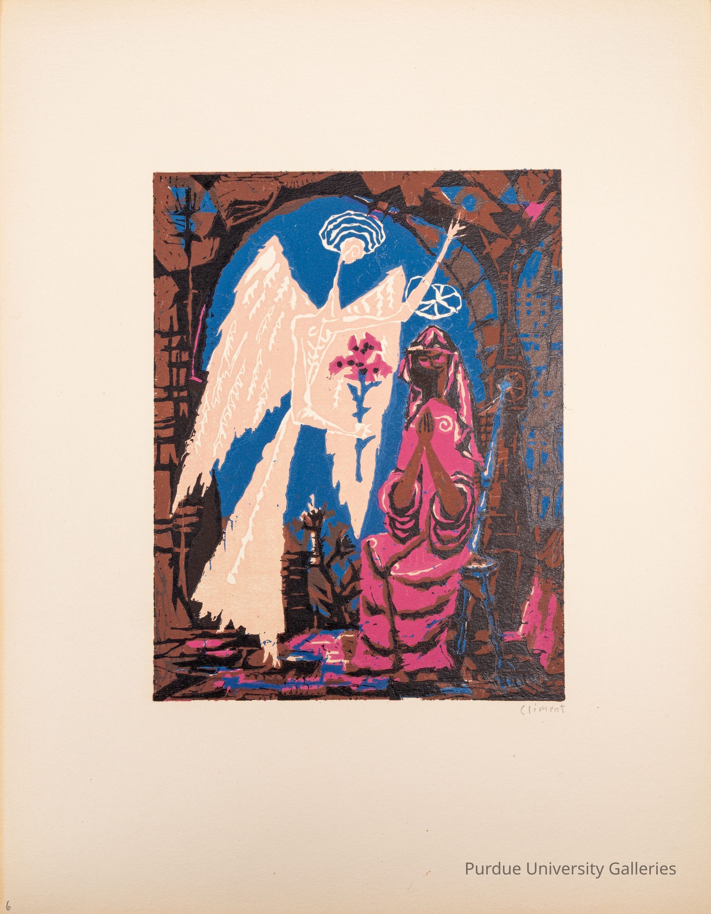 Multilayered linocut with a multiblock or reduction print. The image is a religious motif of angels and praying. Each color is bold and isn't transparent.Type of Print