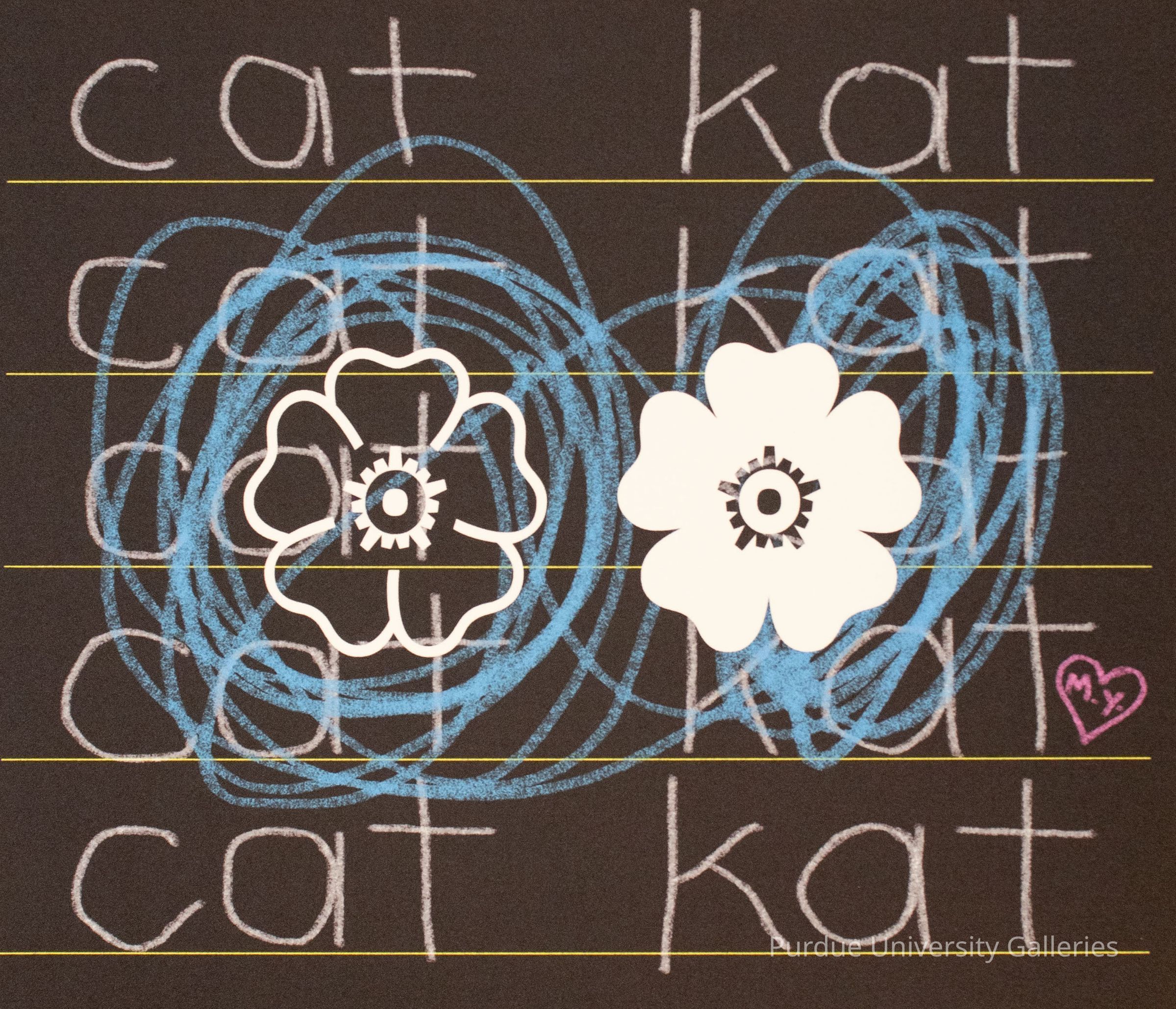 8" x 10" cardstock with black background. Blackboard design with 'cat' and 'kat' repeated 5 times in columns parallel to one another and separated by a yellow line under each set. in the middle of the image are two flowers - a positive and negative of one another which have been printed over two scribbled circles in blue. At 'kat' fourth down and next to the T is a red heart with the initials "M.Y." in it. On reverse side at bottom edge printed in pencil from left to right "14/20," "Kathryn Reeves." Stamped in upper half is the title and authors information, "A rose is a rose," Kathryn J. Reeves, c. 2008, kreeves@purdue.edu."Type of Print
