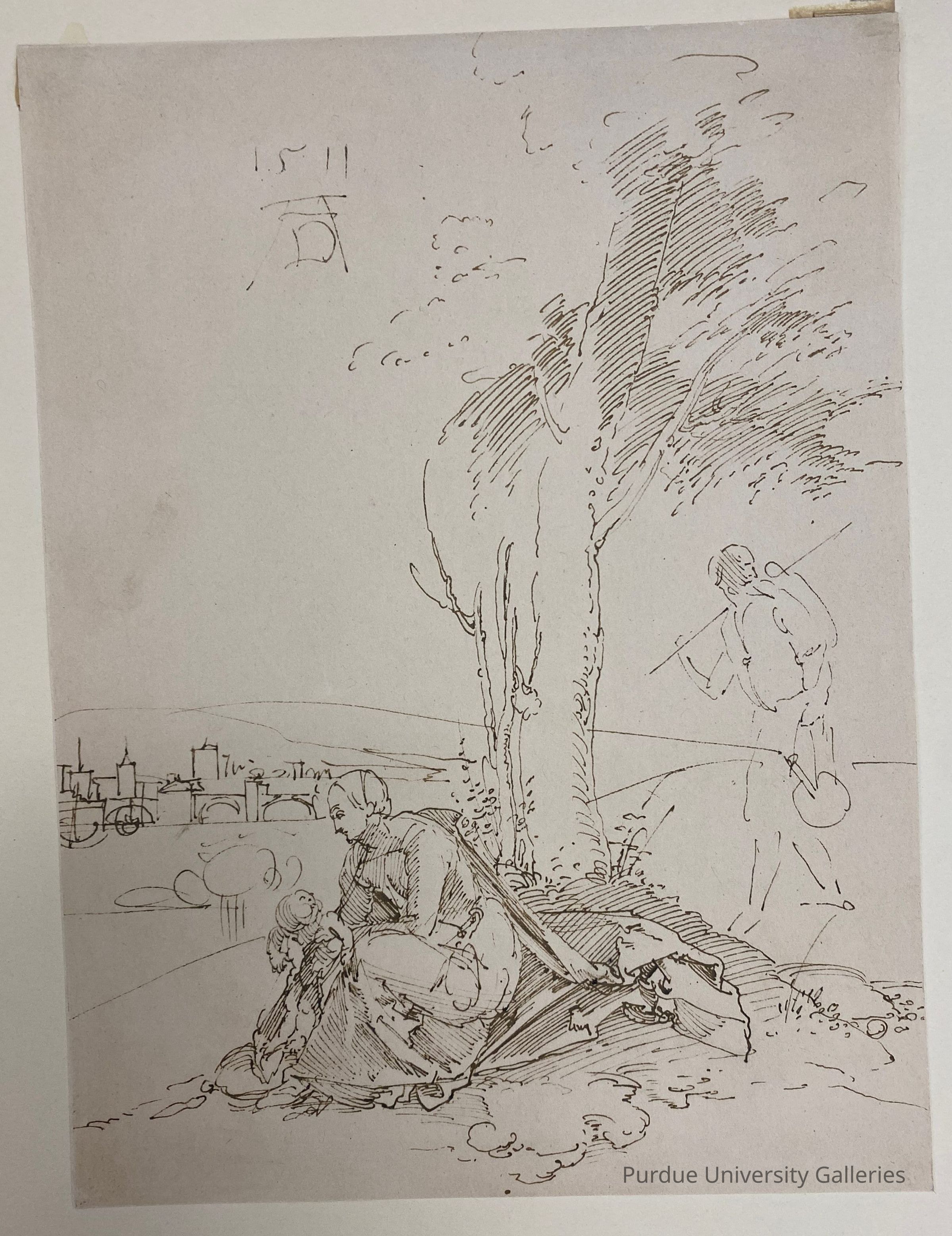 Reproduction drawing of a woman and child sitting under a tree with a city far in the background.